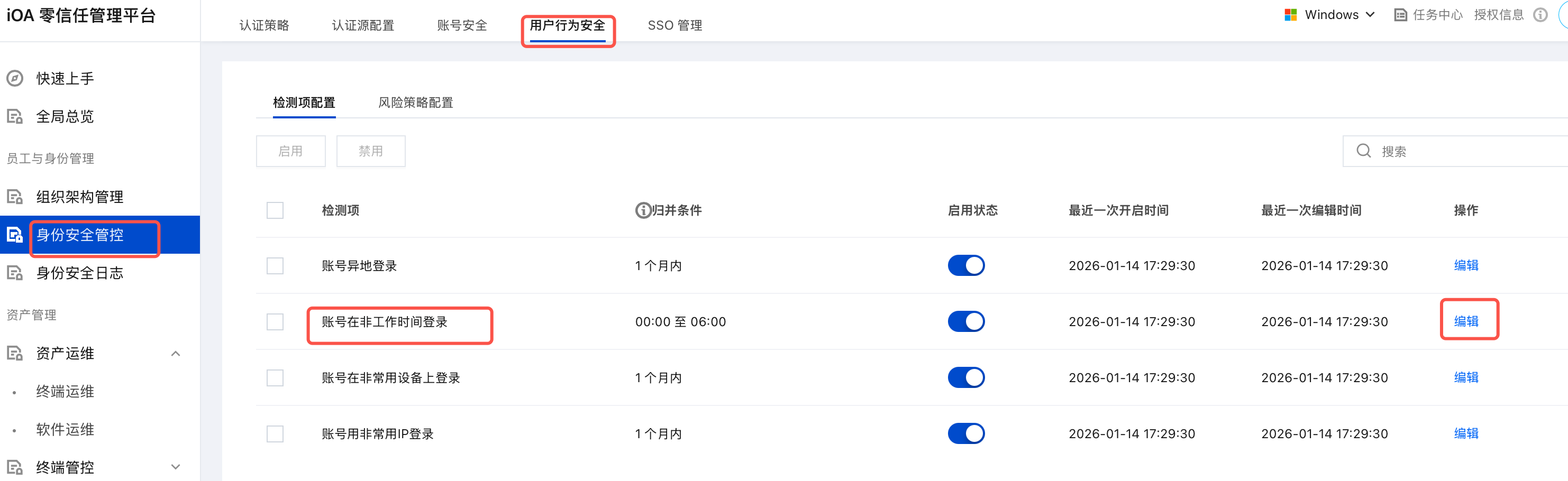 2. 在用户行为安全页面,选择检测项配置,单击账号在非工作时间登录的编辑。