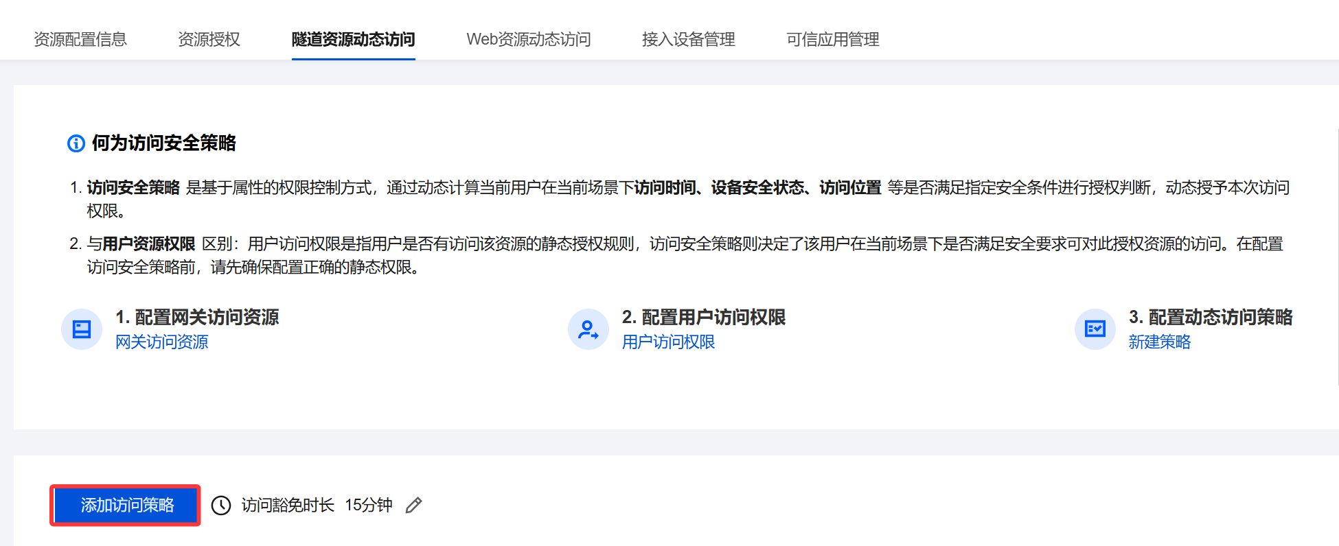 1. 登录 iOA 零信任管理平台控制台,选择可信接入管理 > 隧道资源动态访问,单击添加访问策略。