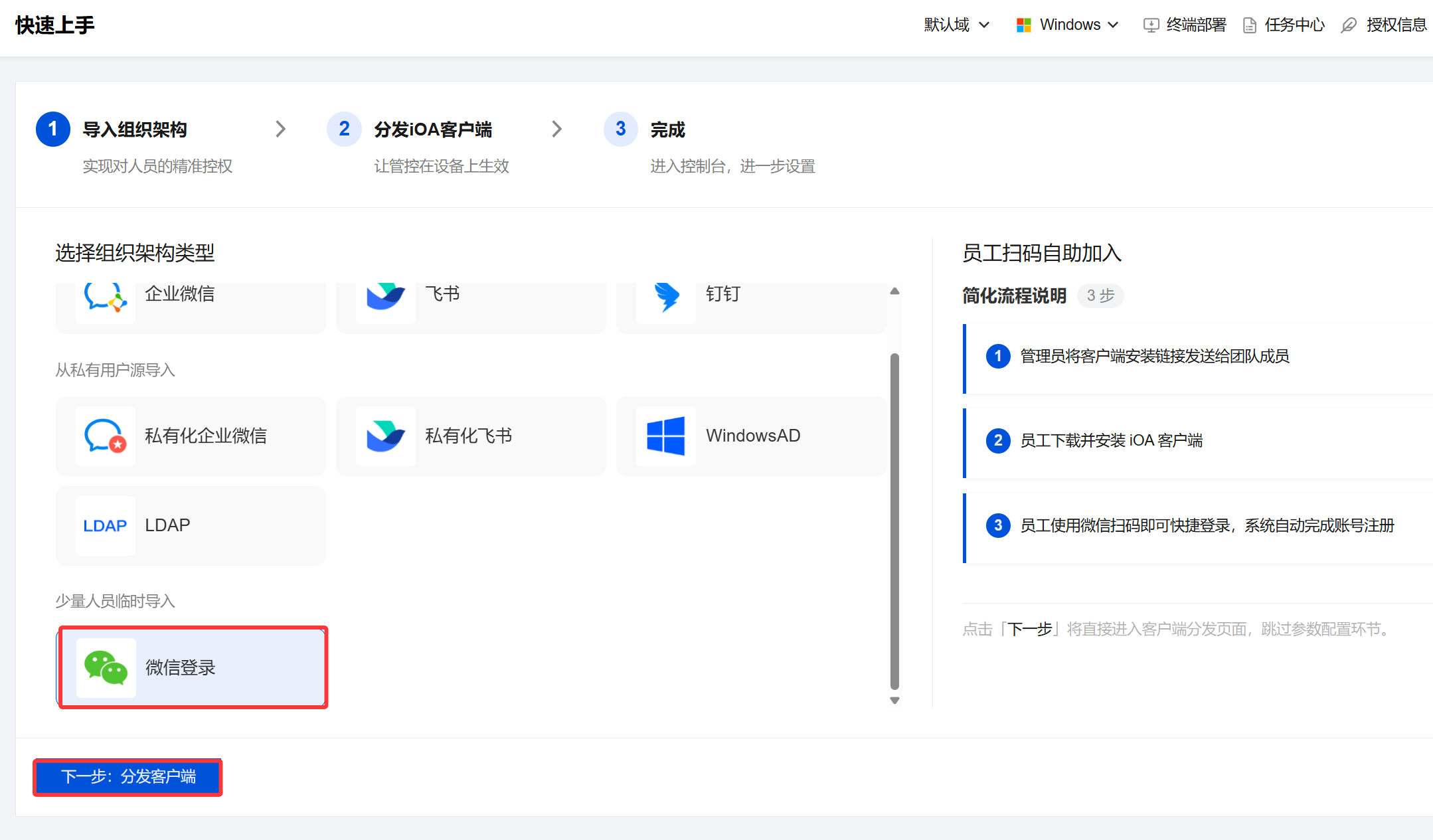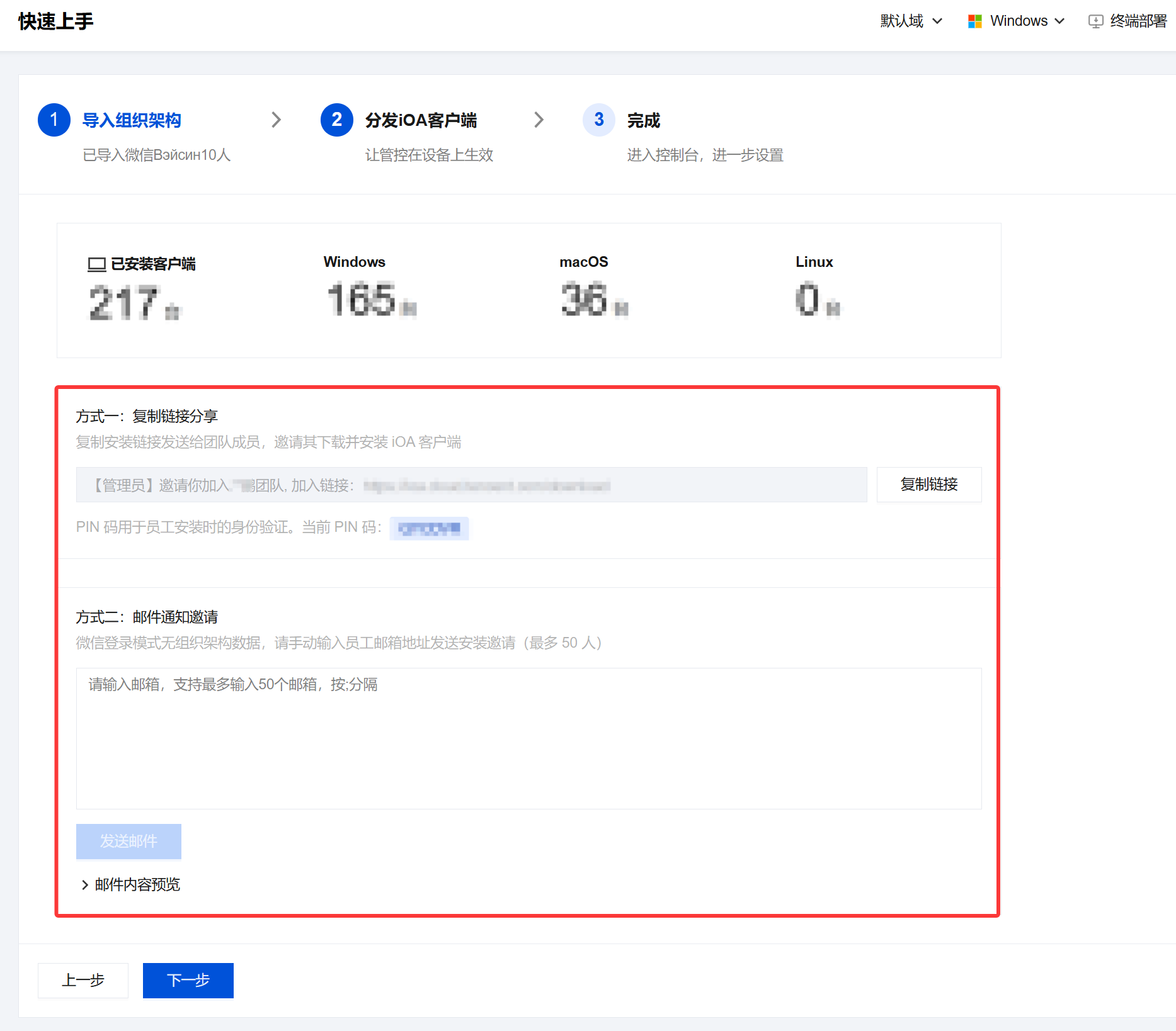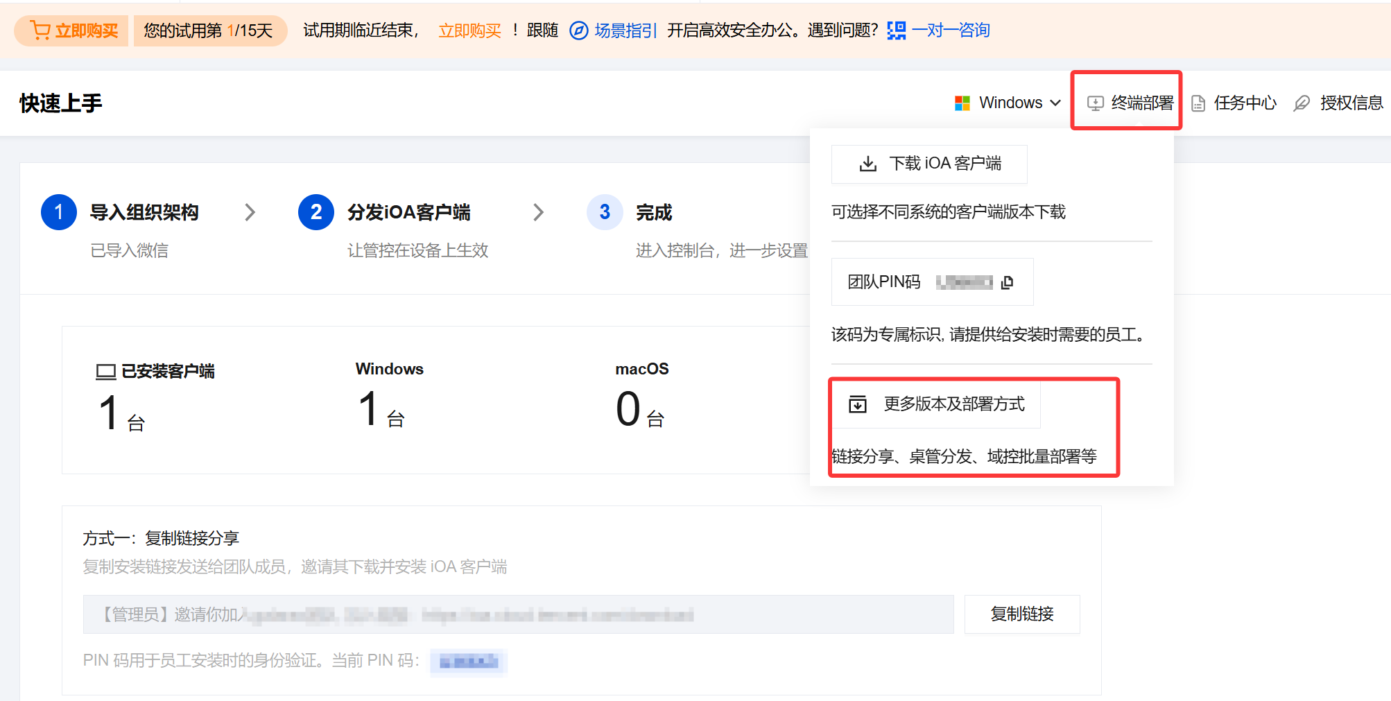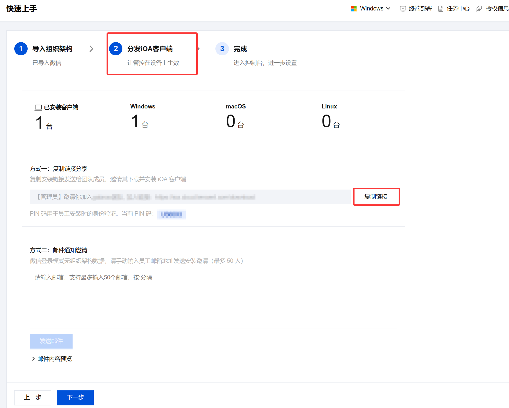 2. 默认提供了客户端下载地址,企业管理员可以将客户端下载链接直接发送/邮件发送给员工,员工单击链接即可下载 iOA 客户端。