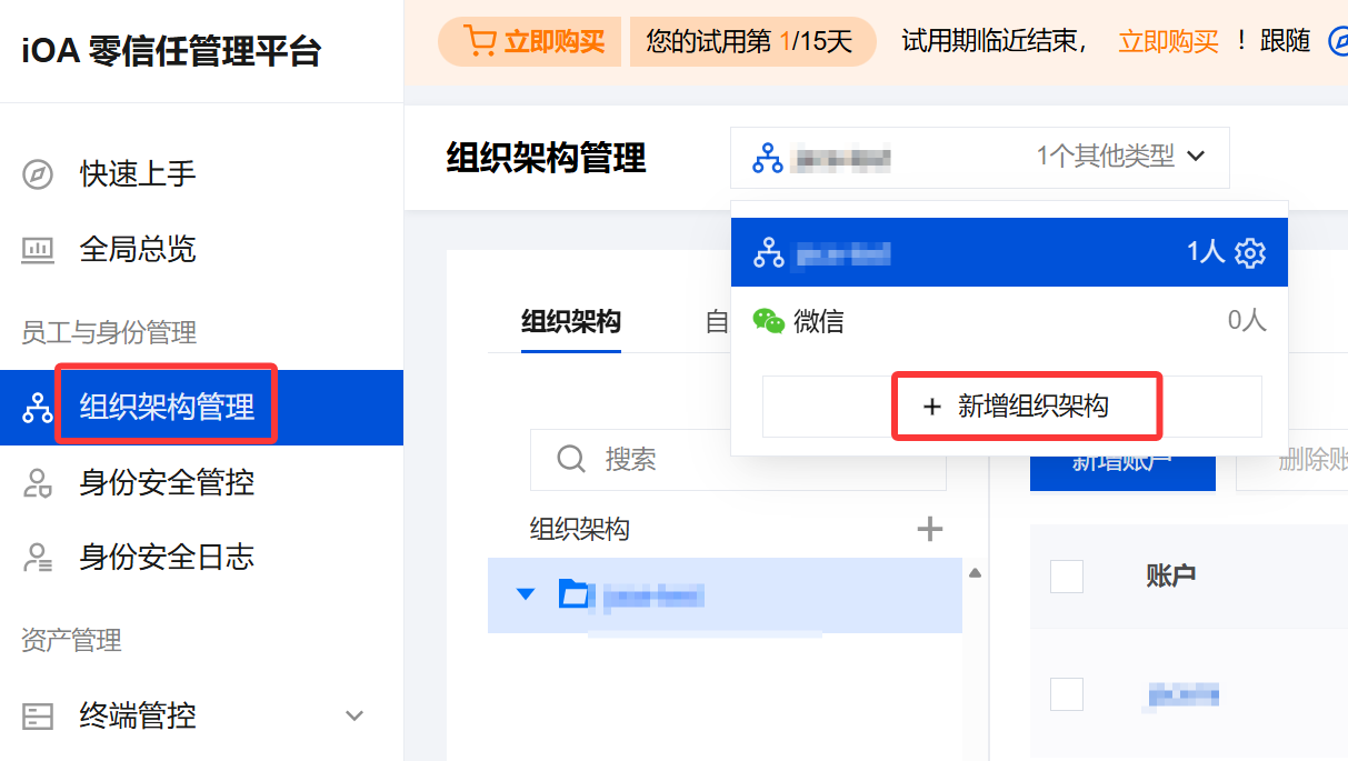 7. 员工完成客户端扫码登录后,会在 iOA 控制台的:员工与身份管理 > 组织架构管理自动创建“微信临时组织”目录。