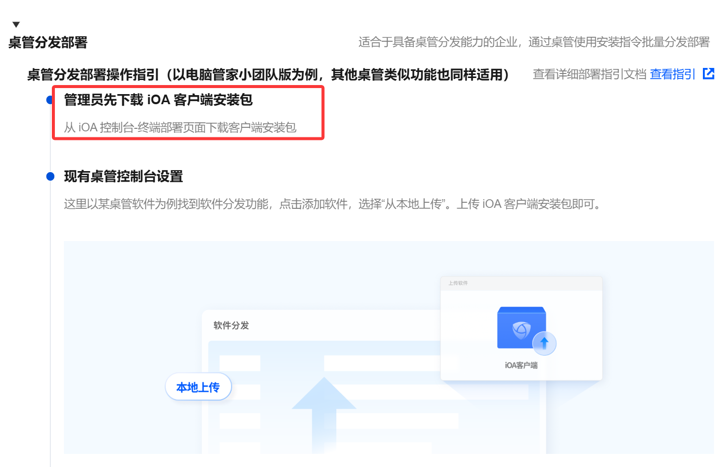 部分企业内部已经有了桌面管理的相关产品,可以使用桌面管理软件的软件分发功能对 iOA 安装包进行统一分发,员工终端设备接收到 iOA 安装包后,一键安装即可。