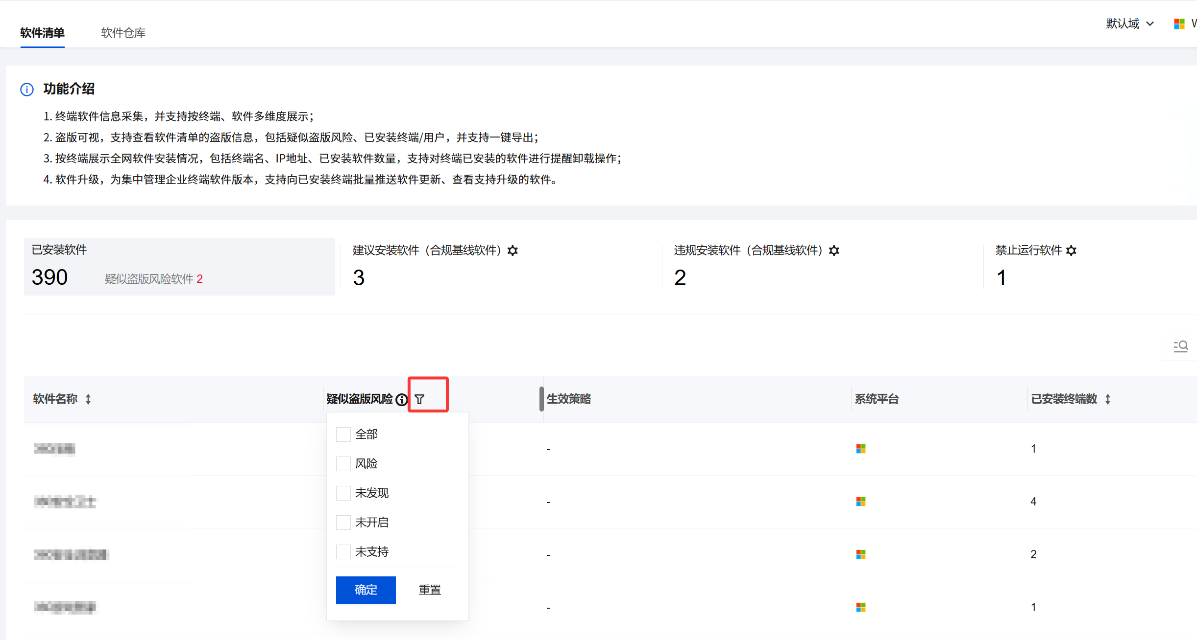未开启:软件未开启盗版检测,可前往软件管控 > 盗版软件检测 开启检测功能。