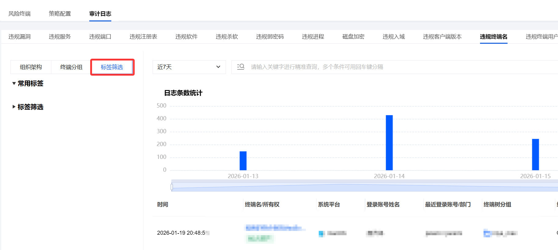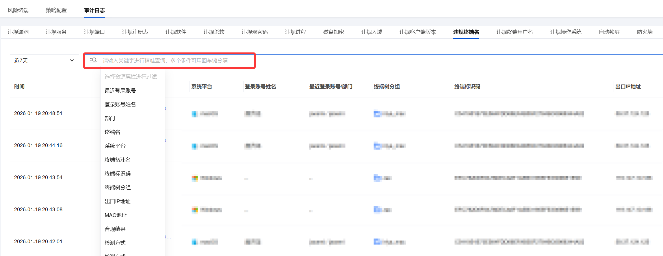 关键字精准查询:在“请输入关键字进行精准查询”的搜索框内,您可以输入特定关键字(如:最近登录账号、部门、合规结果等),系统将筛选出包含此关键字的日志记录。
