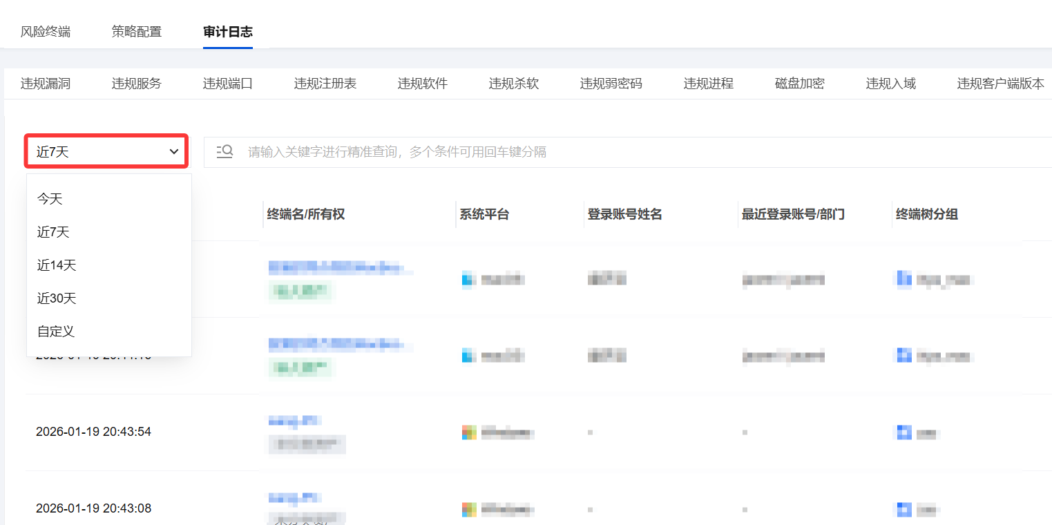 通过顶部左上角的 “近7天” 下拉选择框,您可以快速切换查看“今天”、“近7天” 、“近14天”、“近30天”、“自定义日期”等不同时间范围内的审计日志。