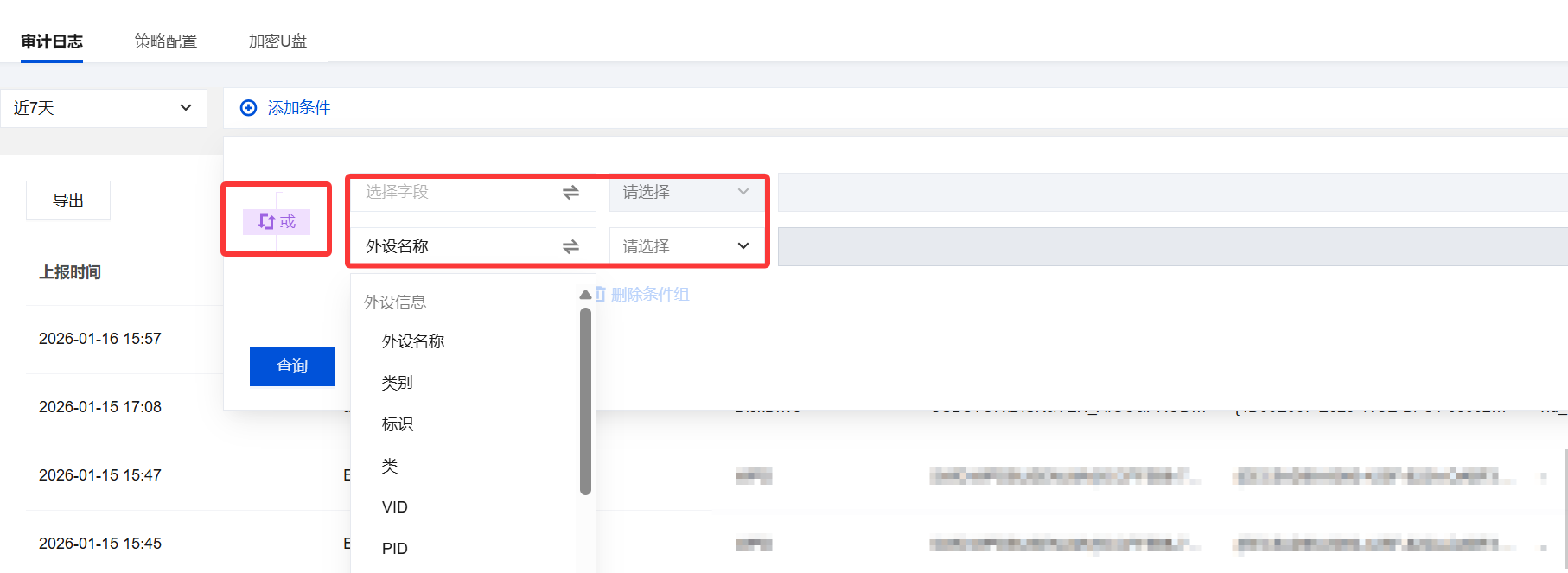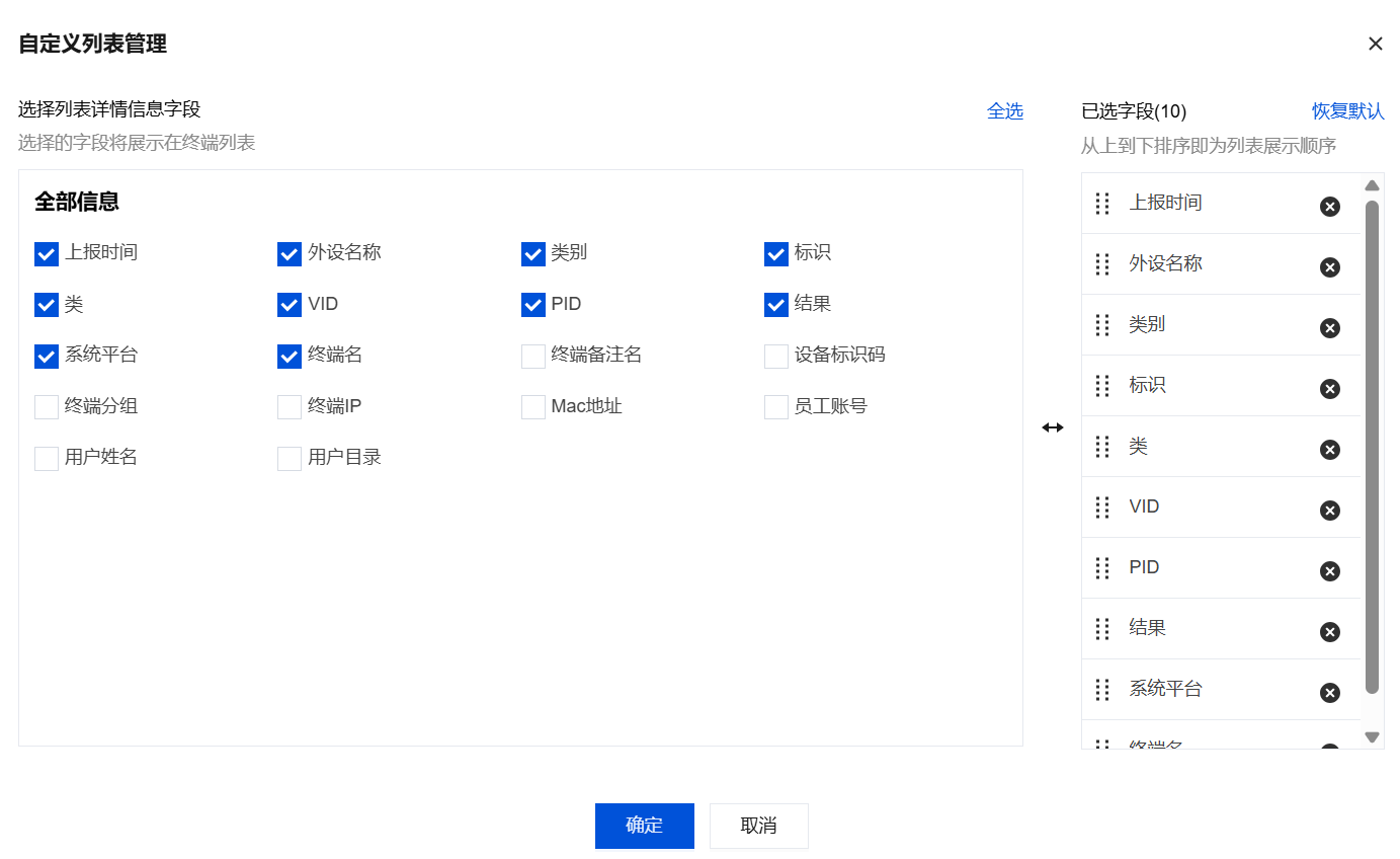 用于记录、查询和导出终端用户近期的所有外设操作事件。通过此页面,管理员可查看 USB 设备等外设的使用情况,进行安全审计、事件追溯与合规性分析。