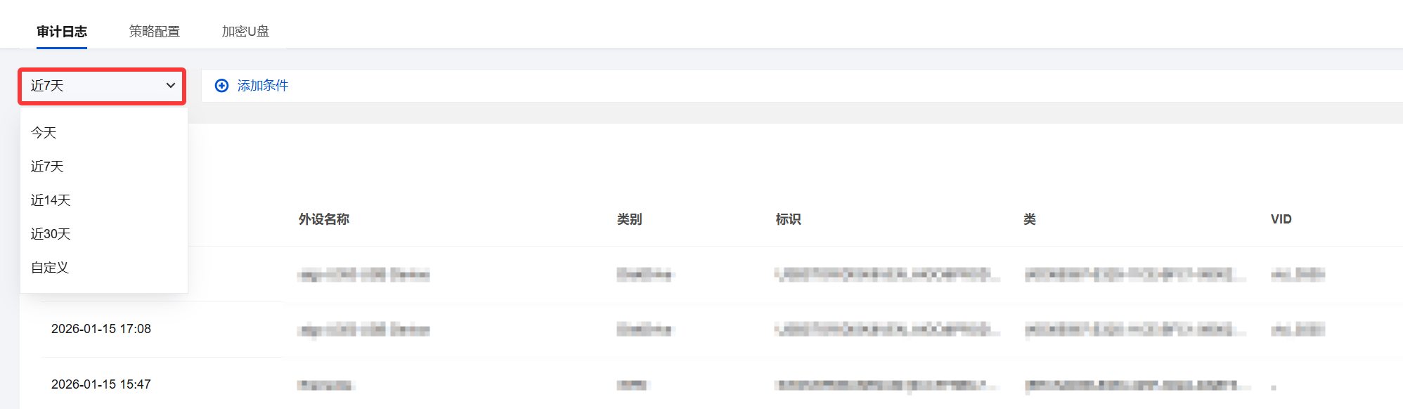 2. 支持时间段筛选,提供标准时间筛选控件:通过顶部左上角的 “近7天” 下拉选择框,您可以快速切换查看“今天”、“近7天” 、“近14天”、“近30天”、“自定义日期”等不同时间范围内的审计日志。