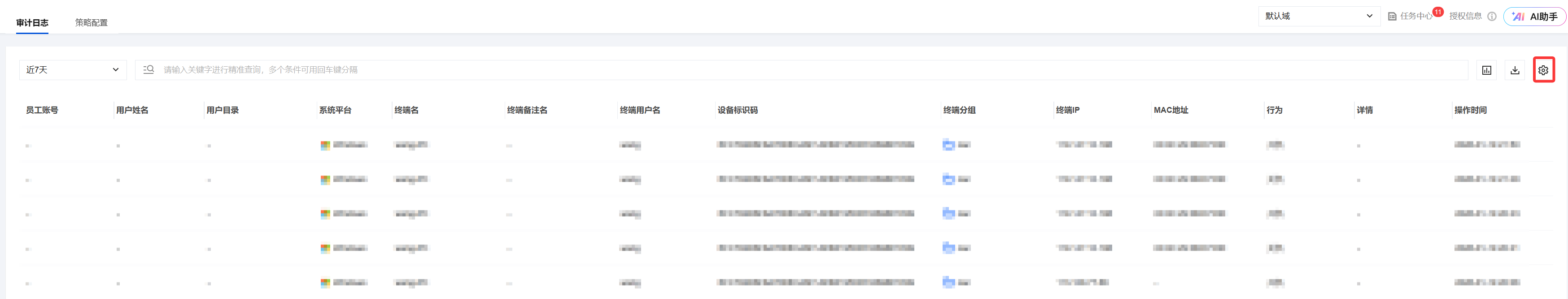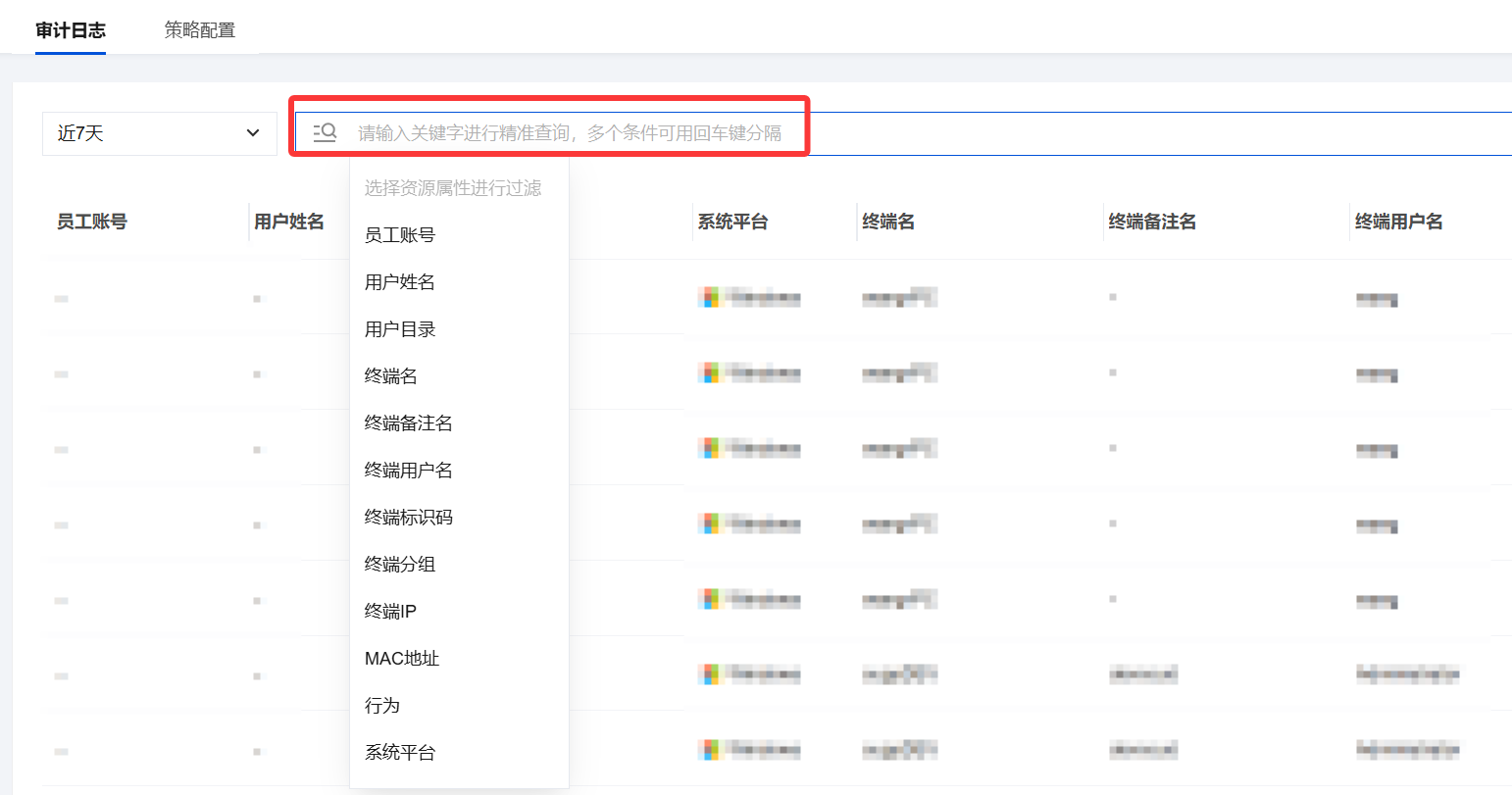 3. 关键字精准查询:在“请输入关键字进行精准查询”的搜索框内,您可以输入特定关键字(如:终端用户名、行为等),系统将筛选出包含此关键字的日志记录。