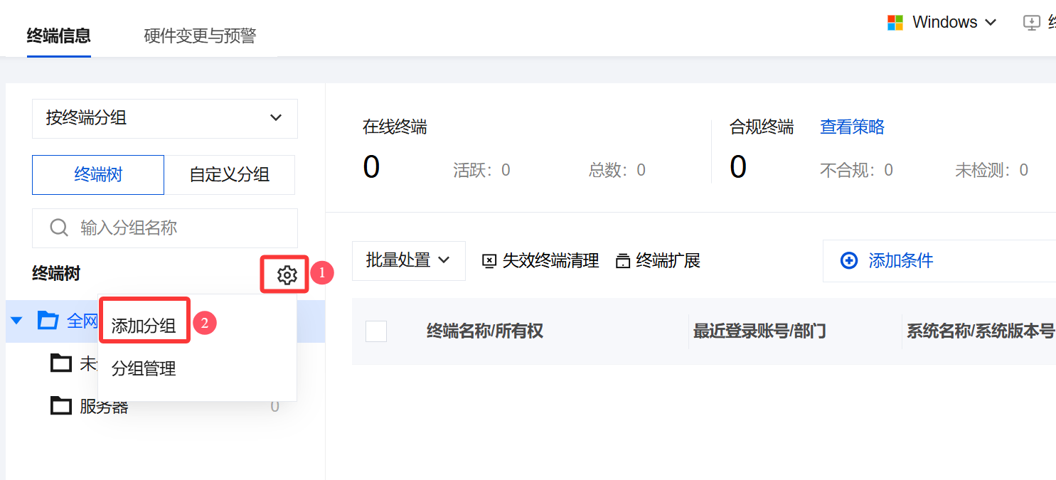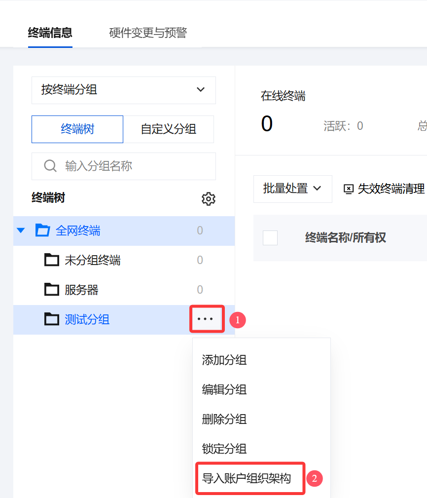 终端安全版并非必须要导入用户源,可以通过终端列表的终端树(终端目录架构)维度进行终端管控及安全策略下发。