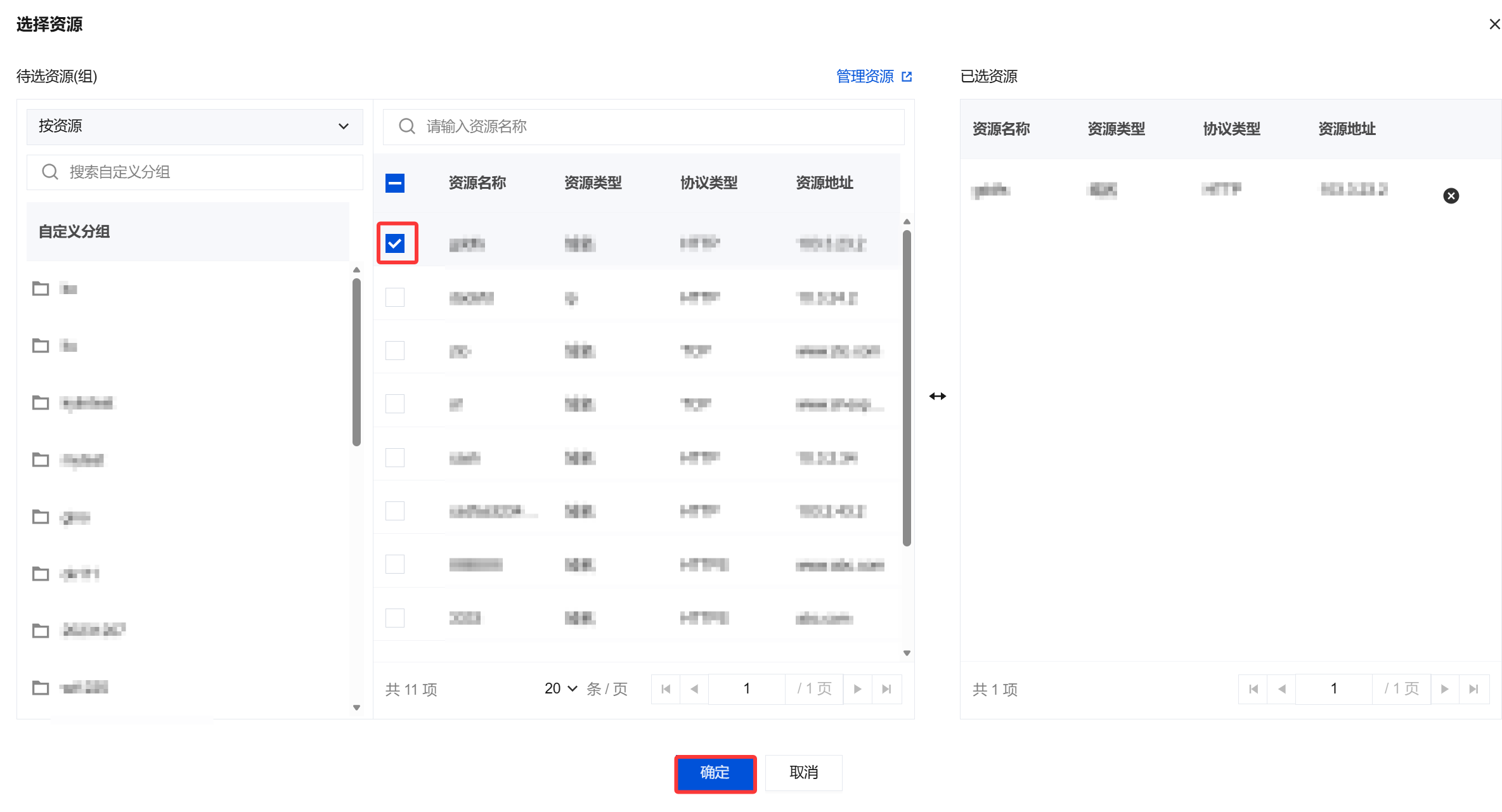 2. 在资源授权窗口中,选择所需资源,单击确定。