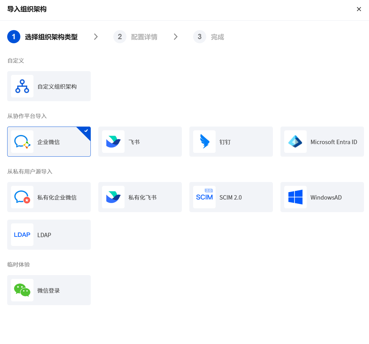 iOA 支持 WindowsAD、SCIM 2.0、政务微信/私有化企业微信等多种用户源。