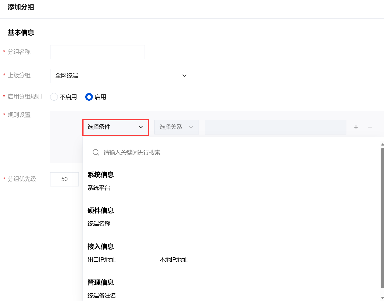 启用分组规则 | 不启用:终端不进行自动分组。(此处选择不启用) 启用:终端树分组支持根据本地 IP、终端名称、终端备注名等设定分组规则,终端设备将根据这些分组规则自动归入相应的指定分组。 ![]() |