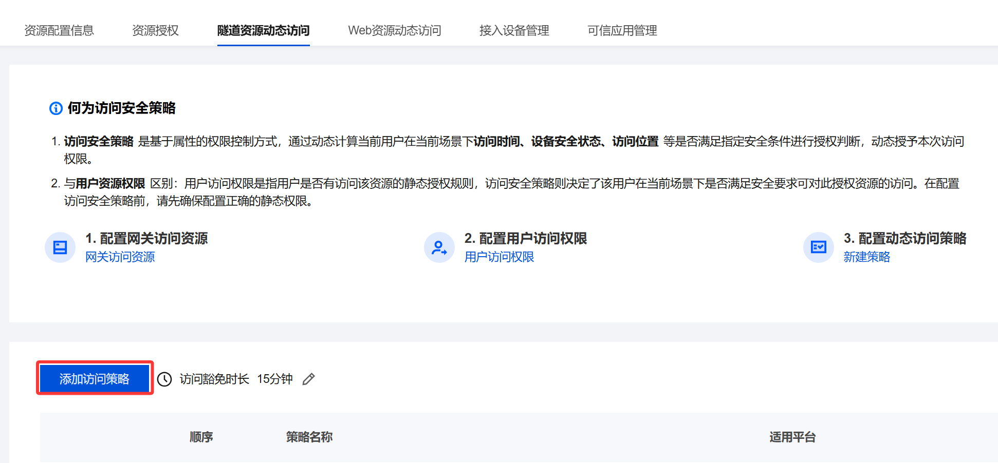 1. 登录 iOA 零信任管理平台控制台,在左侧导航栏,选择可信接入管理 >隧道资源动态访问,单击添加访问策略。
