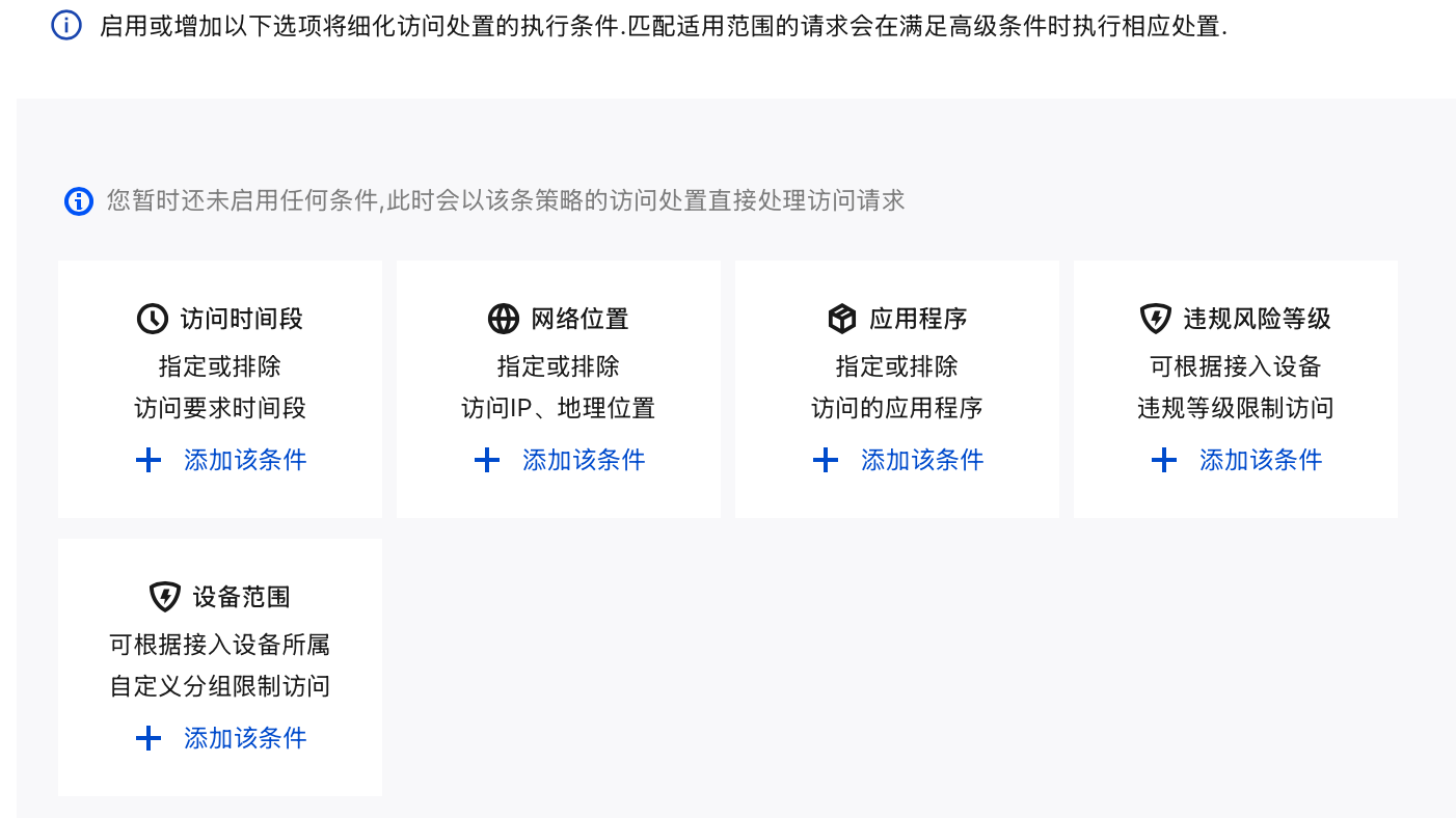 2.4 高级条件设置:单击添加该条件,增加以下选项将细化访问处置的执行条件,匹配适用范围的请求会在满足高级条件时执行相应处置。
