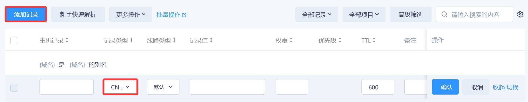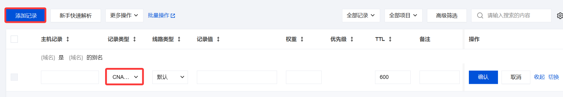 2. 在记录管理页面,单击添加记录,配置相关参数,单击确认。