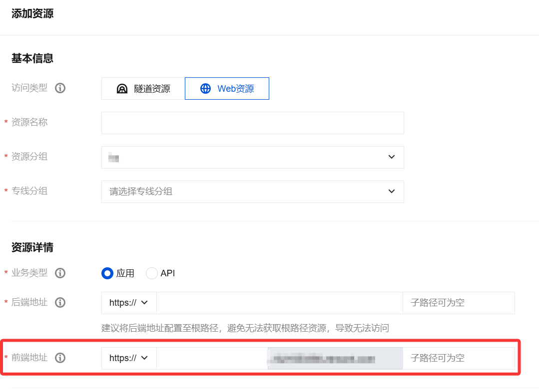 2. 在应用配置信息页面,单击添加资源,选择 Web 资源,需注意自定义域名及端口均属于敏感资源,单击保存。