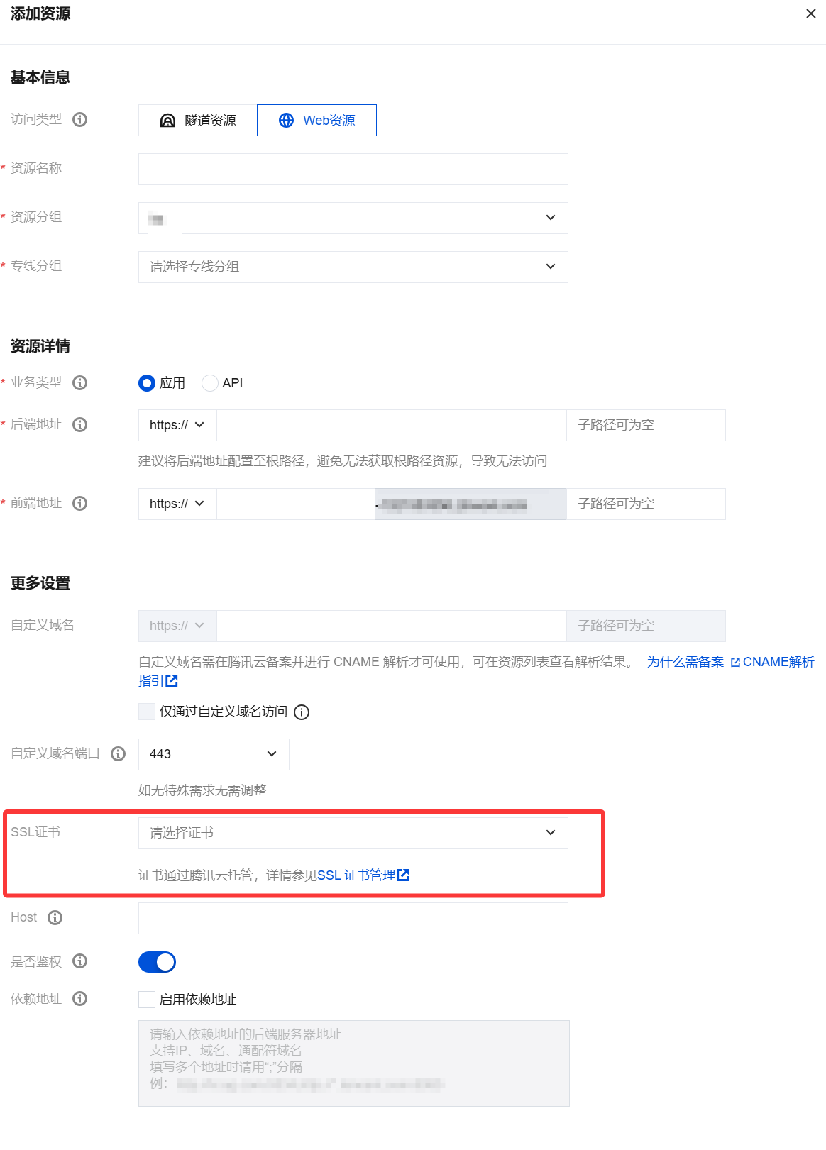 2. 在应用配置信息页面,单击添加资源,选择 Web 资源,如自定义域名使用 HTTPS 进行访问,则选择对应域名 SSL 证书,单击保存。