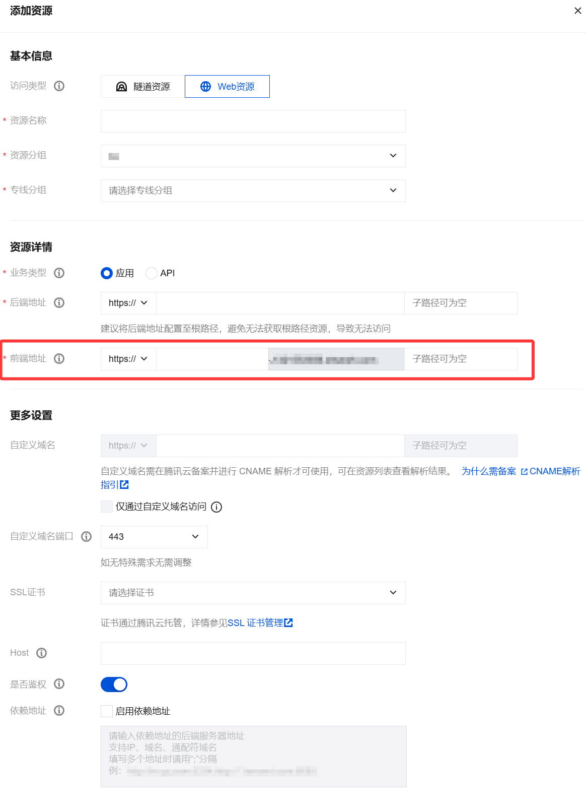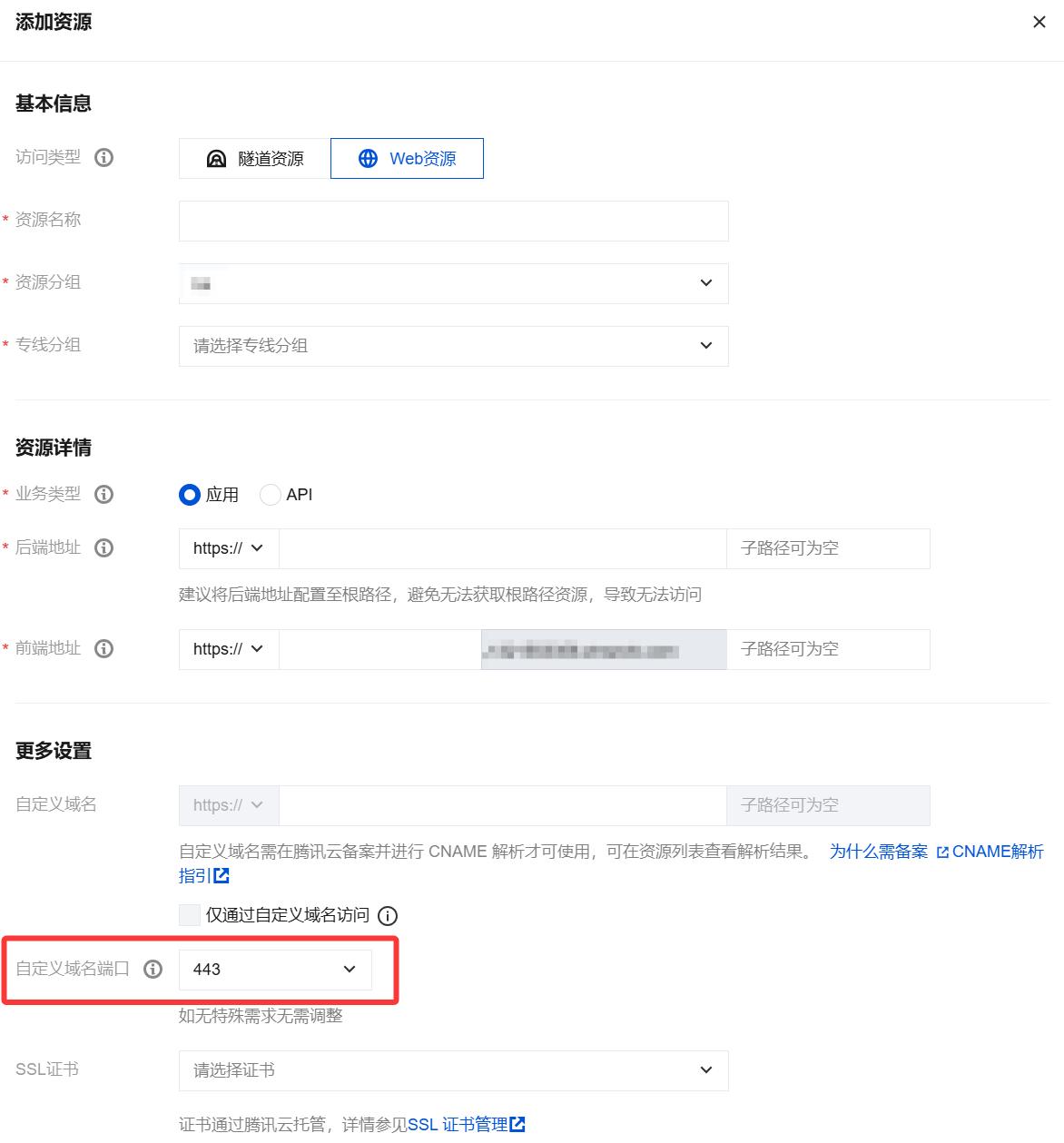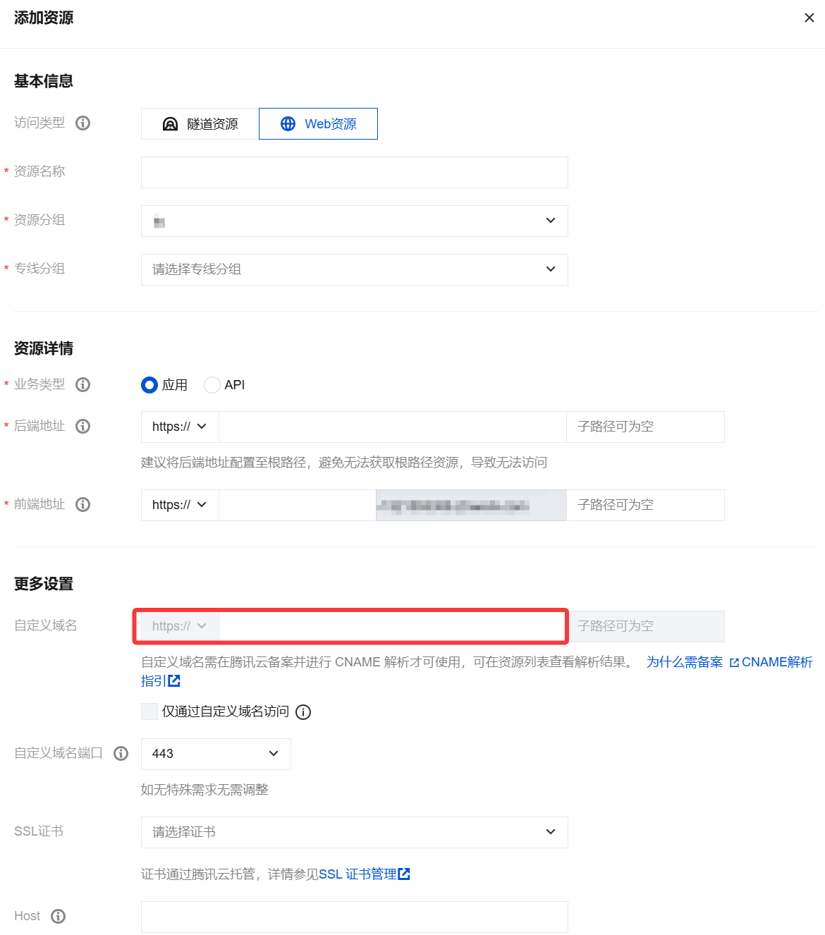 3. 在添加资源页面,访问类型选择 Web 资源,在自定义域名处,输入在腾讯云备案的域名,单击保存。