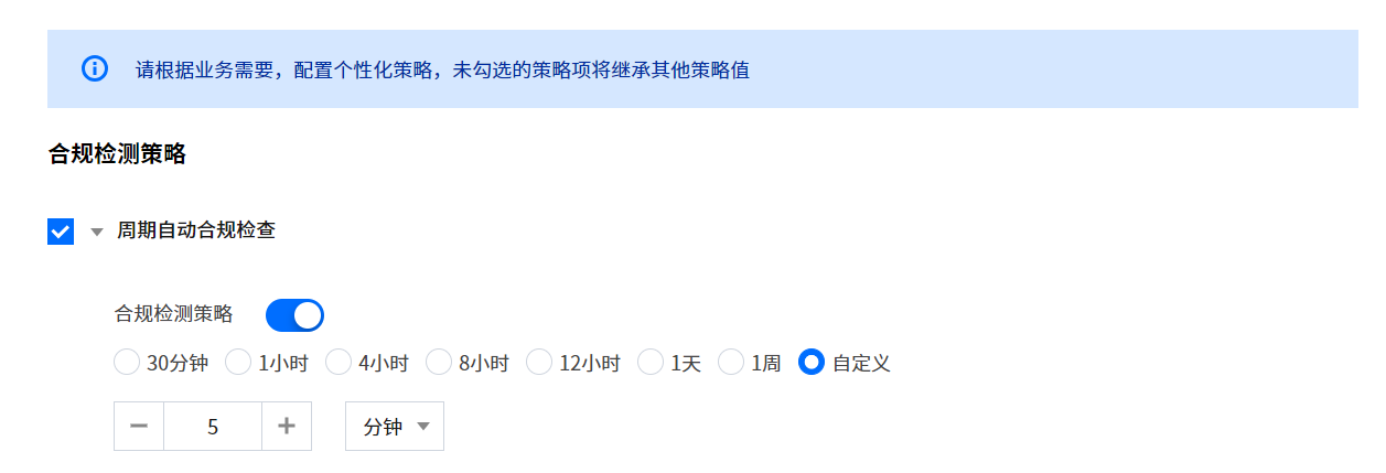 合规检测的触发时机包含 iOA 客户端启动时、打开客户端主界面时、以及管理员配置的定时检测周期触发时;管理员可以配置最短每隔5分钟进行一次合规检测扫描。