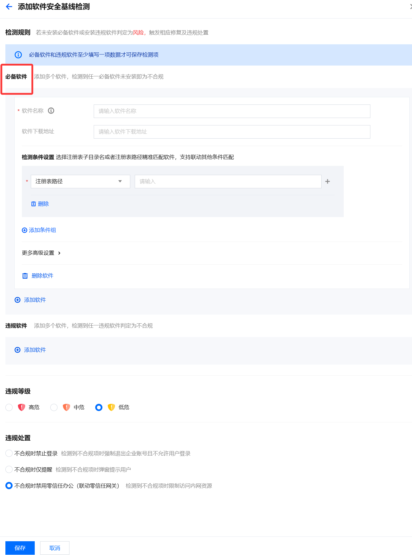 如果您使用的是高级版,可配置用户未安装指定软件,不合规时禁用零信任办公(联动零信任网关),通过限制用户访问业务资源的方式引导终端用户安装指定软件。