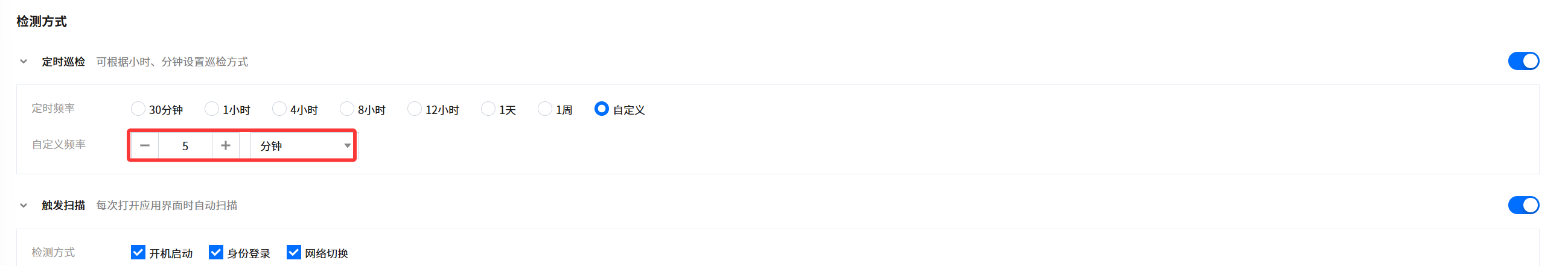 合规检测的触发时机包含开机启动时、身份登录时、网络切换时,以及管理员配置的定时巡检周期触发时;管理员可以配置最短每隔5分钟进行一次合规检测扫描。