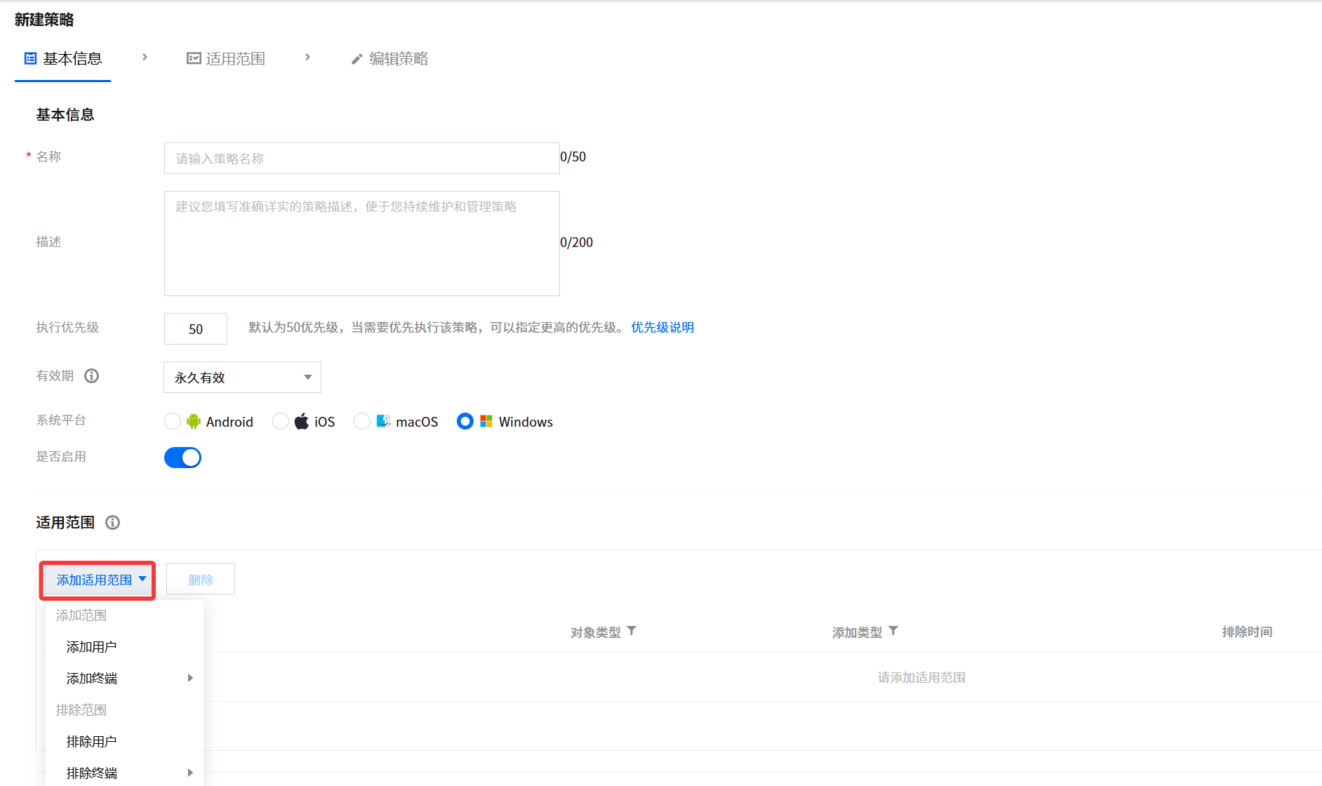 在新建配置页面,添加适用范围时根据企业实际需要进行下发策略对象的选择。
