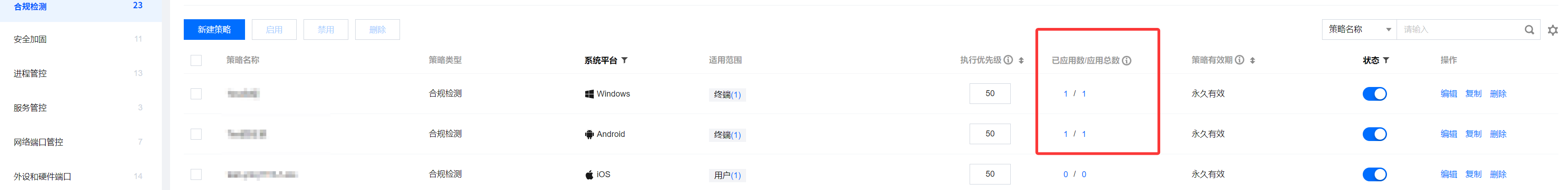 1. 策略配置完成后,可能需要2~4分钟时间下发到用户终端,此时会有一定时间差;您可以在策略列表上查看策略下发状态。