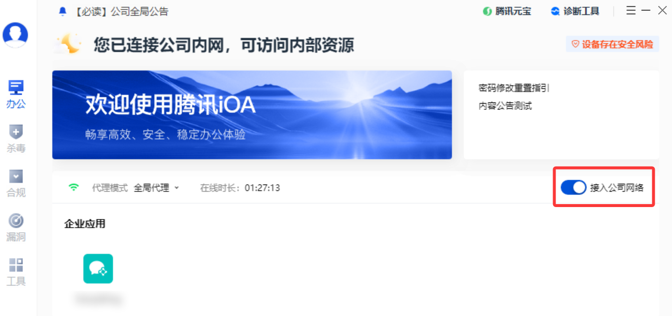 1. 用户登录后,并且在客户端上打开了“接入公司网络”开关时,即会占用并发账号授权。