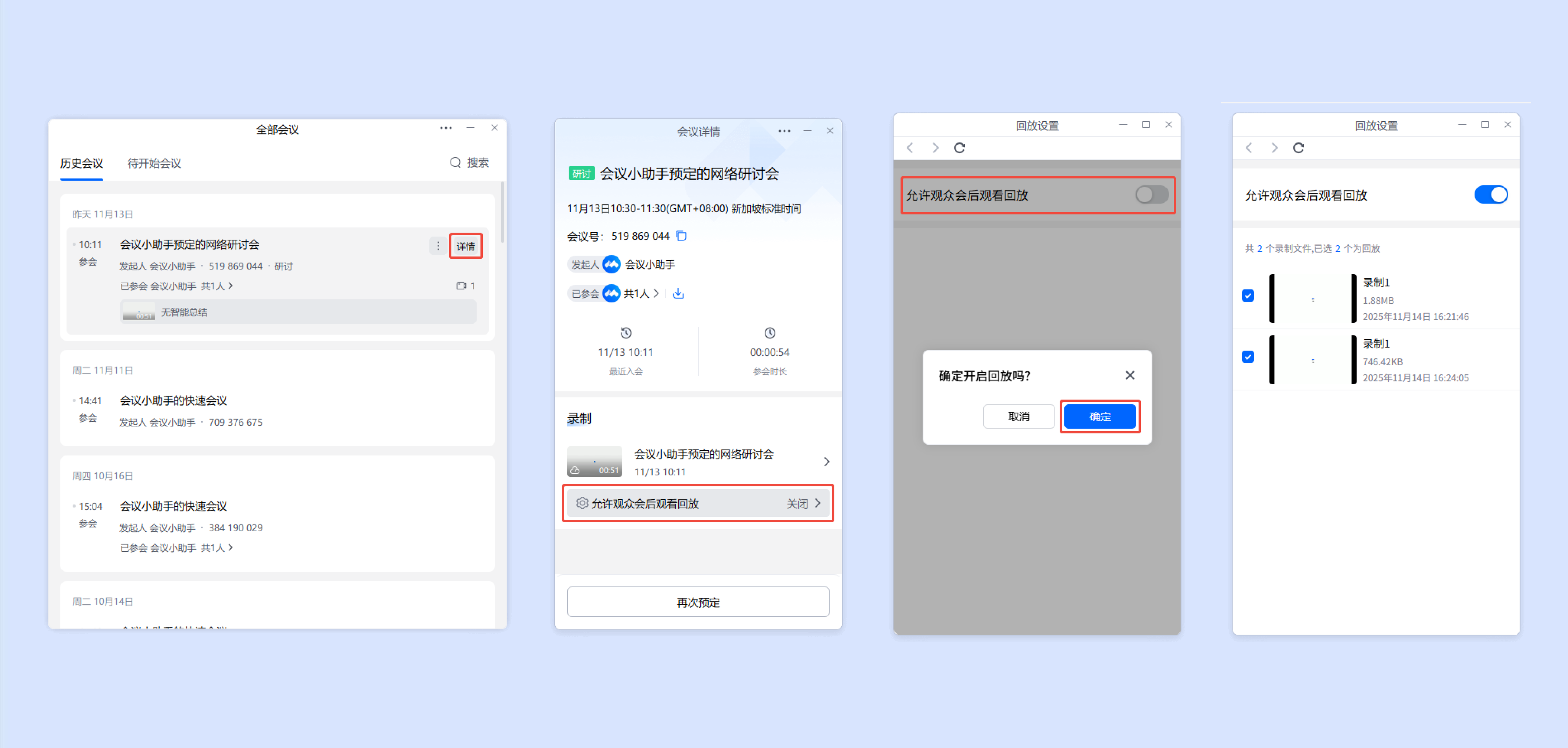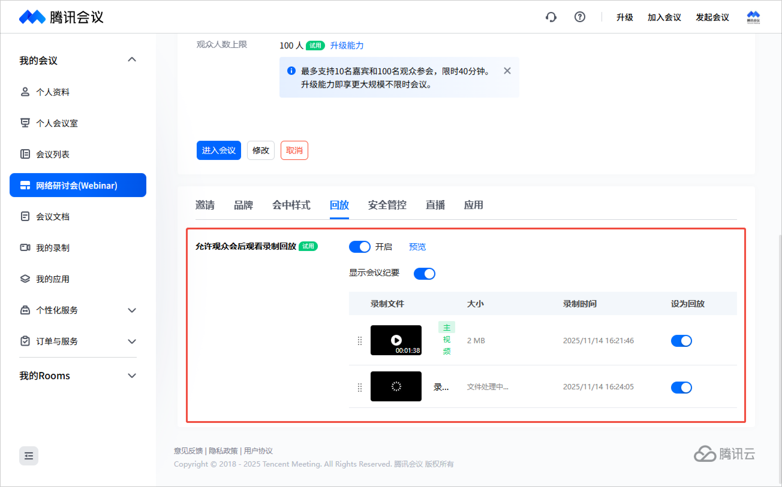 对于会中有开启云录制的网络研讨会,会后创建者可以在会议详情页面,单击回放,开启允许观众会后观看录制回放,可选择是否显示会议纪要、选择开放给用户观看的回放文件、调整回放文件播放顺序,并支持在单个录制文件详情页进行剪辑操作。
