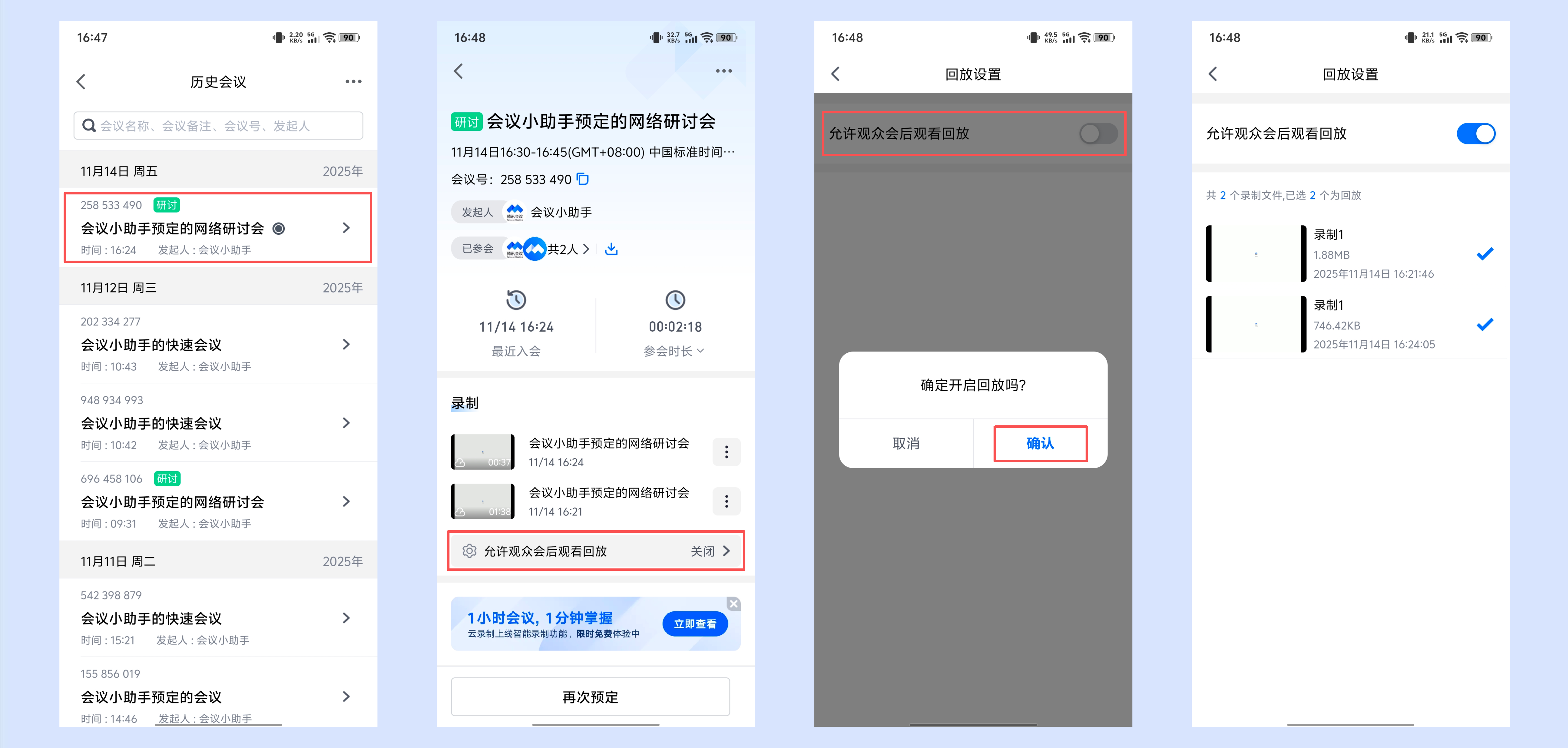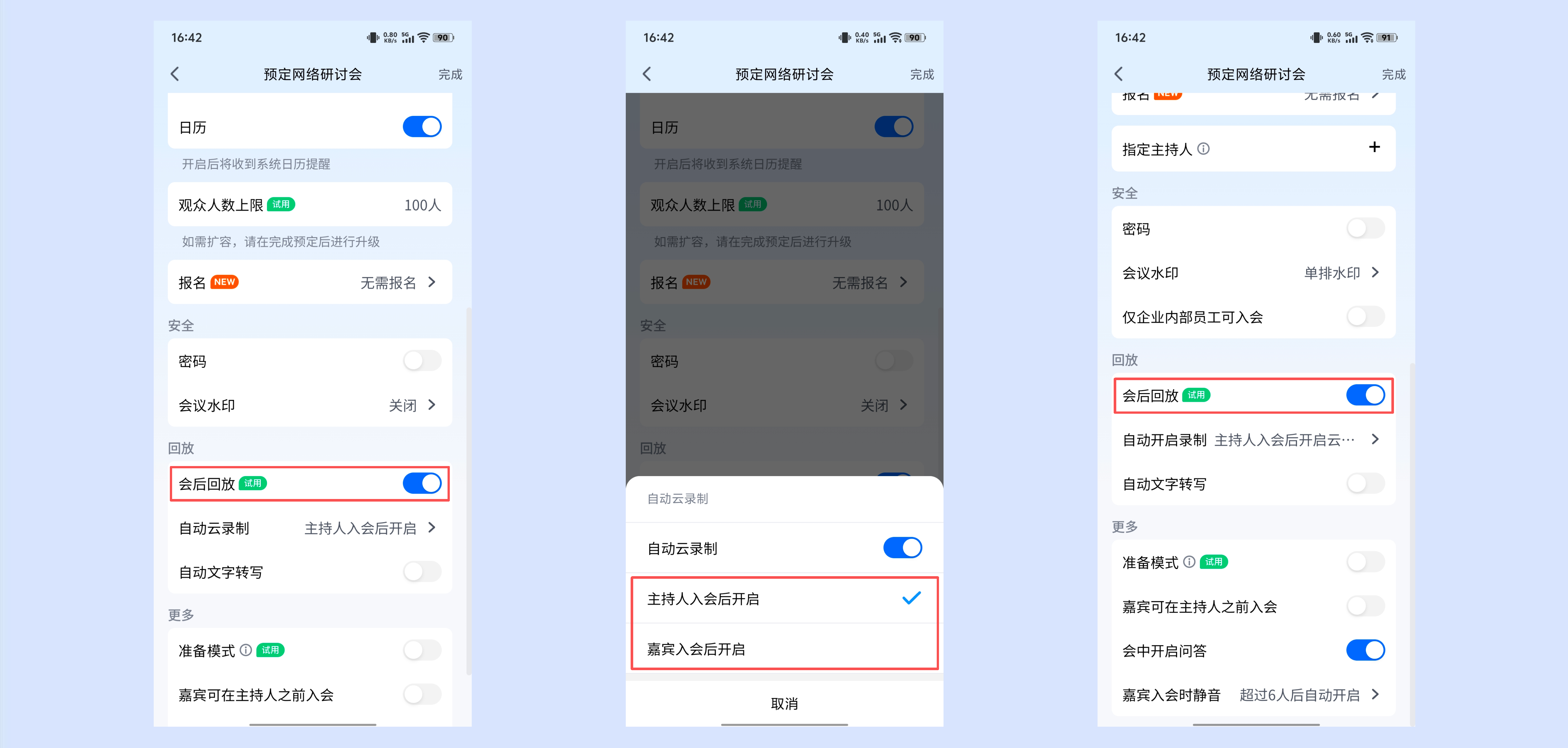 免费版、专业版用户在预定网络研讨会时,勾选开启会后回放,可选择主持人入会后开启/嘉宾入会后开启,设置后即可在主持人/嘉宾加入会议时自动开启云录制,会议结束后观众即可观看回放。