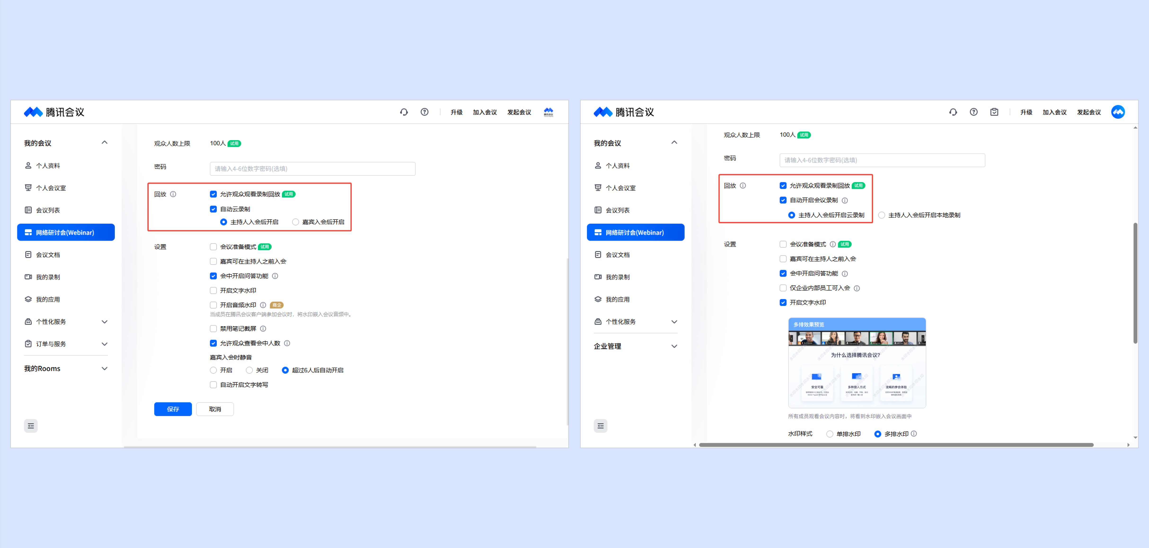 商业版、企业版、教育版、教育加强版用户在预定网络研讨会时,勾选开启会后回放,默认选择主持人入会后开启云录制,设置后即可在主持人加入会议时自动开启云录制,会议结束后观众即可观看回放。