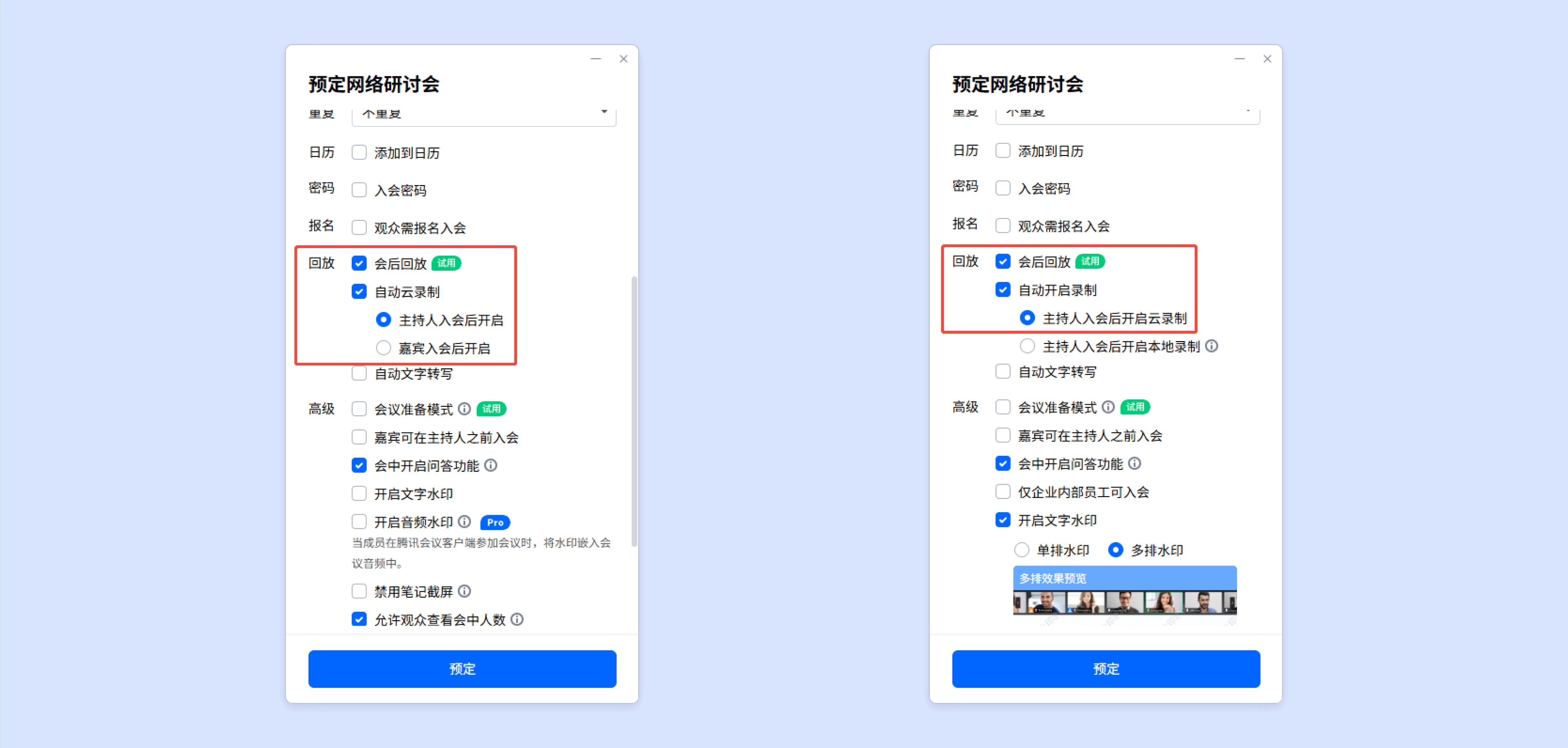 商业版、企业版、教育版、教育加强版用户在预定网络研讨会时,勾选开启允许观众观看录制回放,默认选择主持人入会后开启云录制,设置后即可在主持人加入会议时自动开启云录制,会议结束后观众即可观看回放。