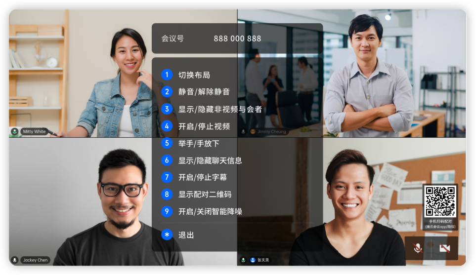 DTMF 菜单显示时,设备的配对二维码同步显示在屏幕右下角,也可选择 DTMF 菜单8显示放大的二维码。二维码默认显示15秒。消失后可在遥控器上调出数字小键盘,按 * 键再次唤起显示。