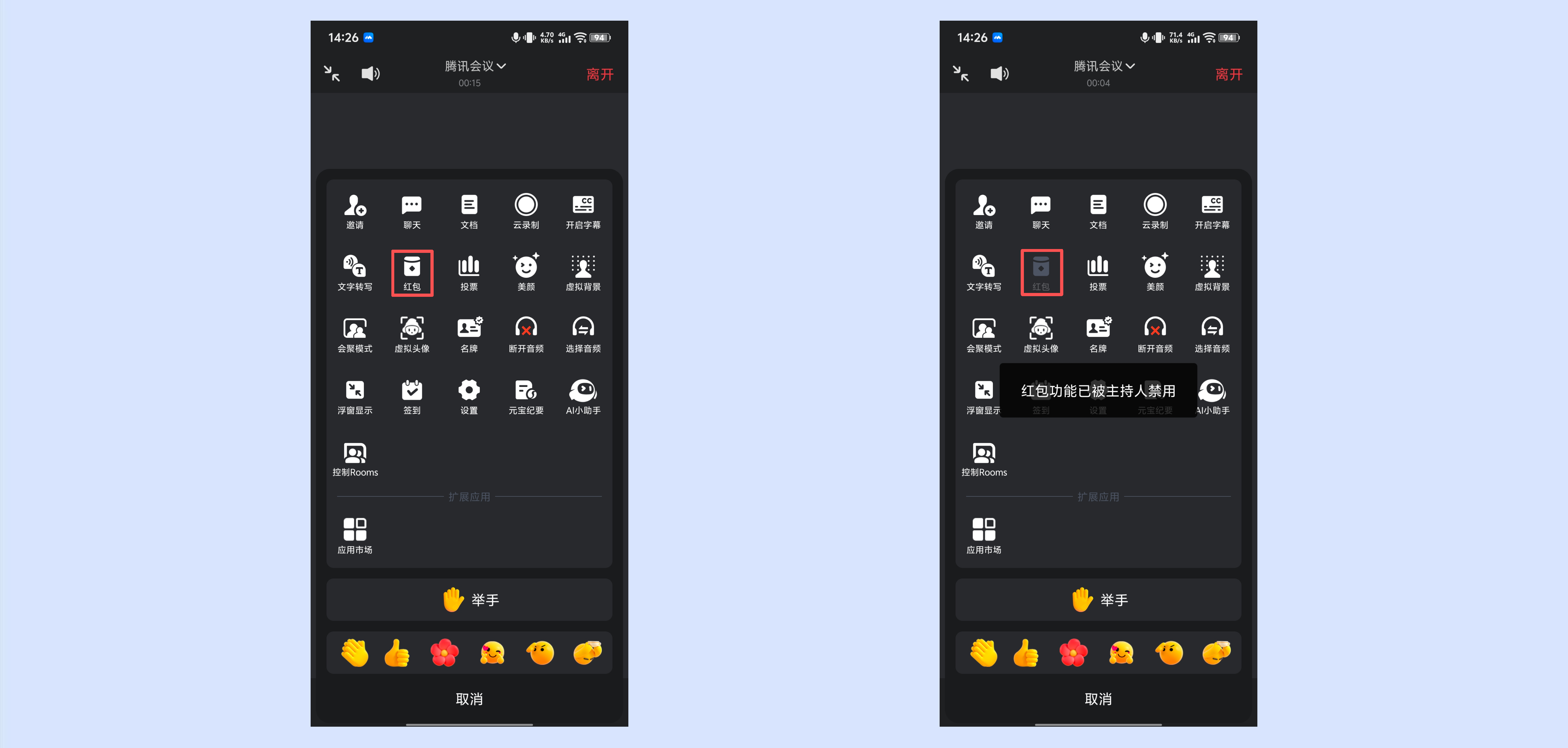 允许发送红包选项默认勾选开启,移动端参会的成员可使用红包功能。若主持人/联席主持人取消勾选允许发送红包选项,则移动端参会的成员的红包功能选项置灰,并在点击时提示红包功能已被主持人禁用。