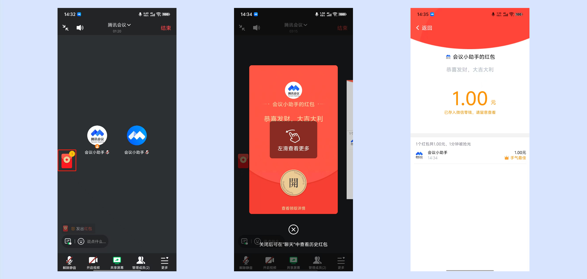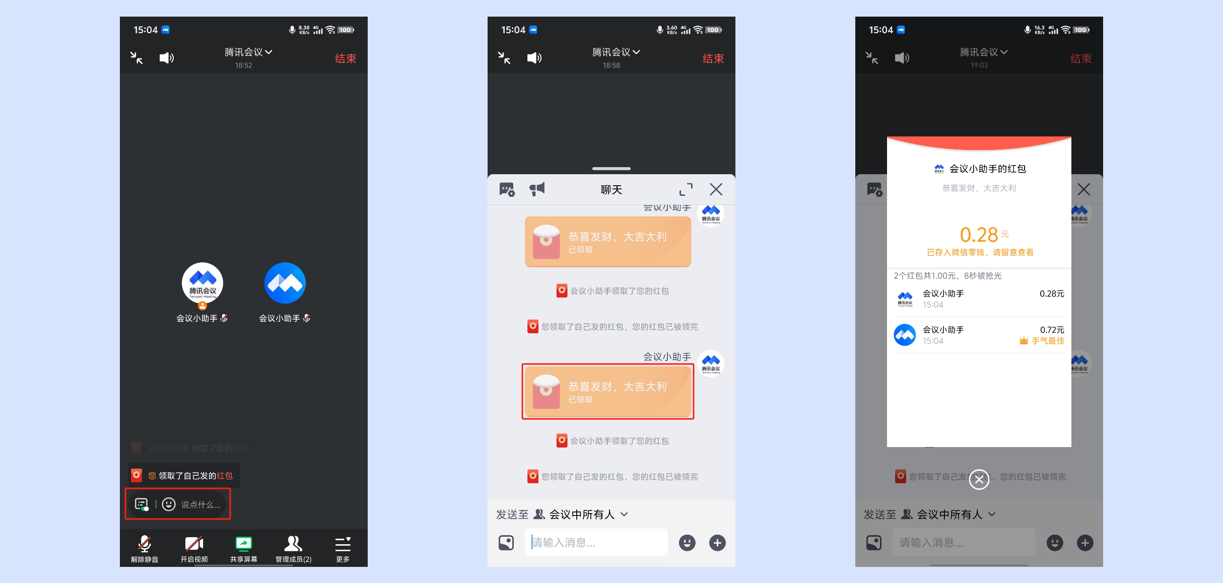 会议结束后,聊天窗口的红包消息会保留到该会议的聊天记录中。