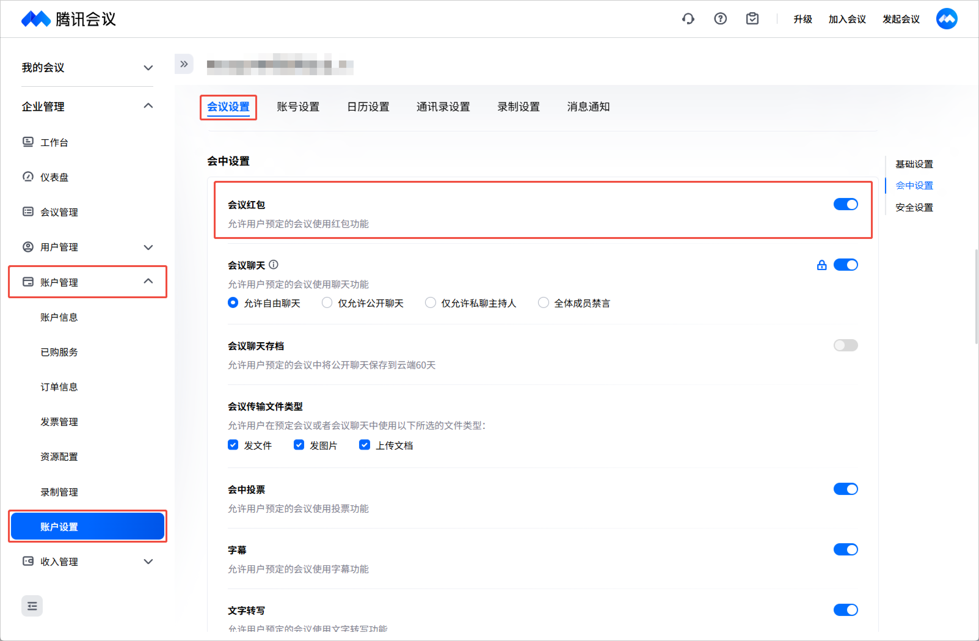 商业版、企业版、教育版、教育加强版的企业超级管理员和有账户管理权限的管理员可以在企业管理后台 > 账户管理 > 账户设置 > 会议设置 > 会中设置中对会议红包功能使用权限进行管理。关闭会议红包功能后,企业下用户所发起的会议均无法使用红包功能。