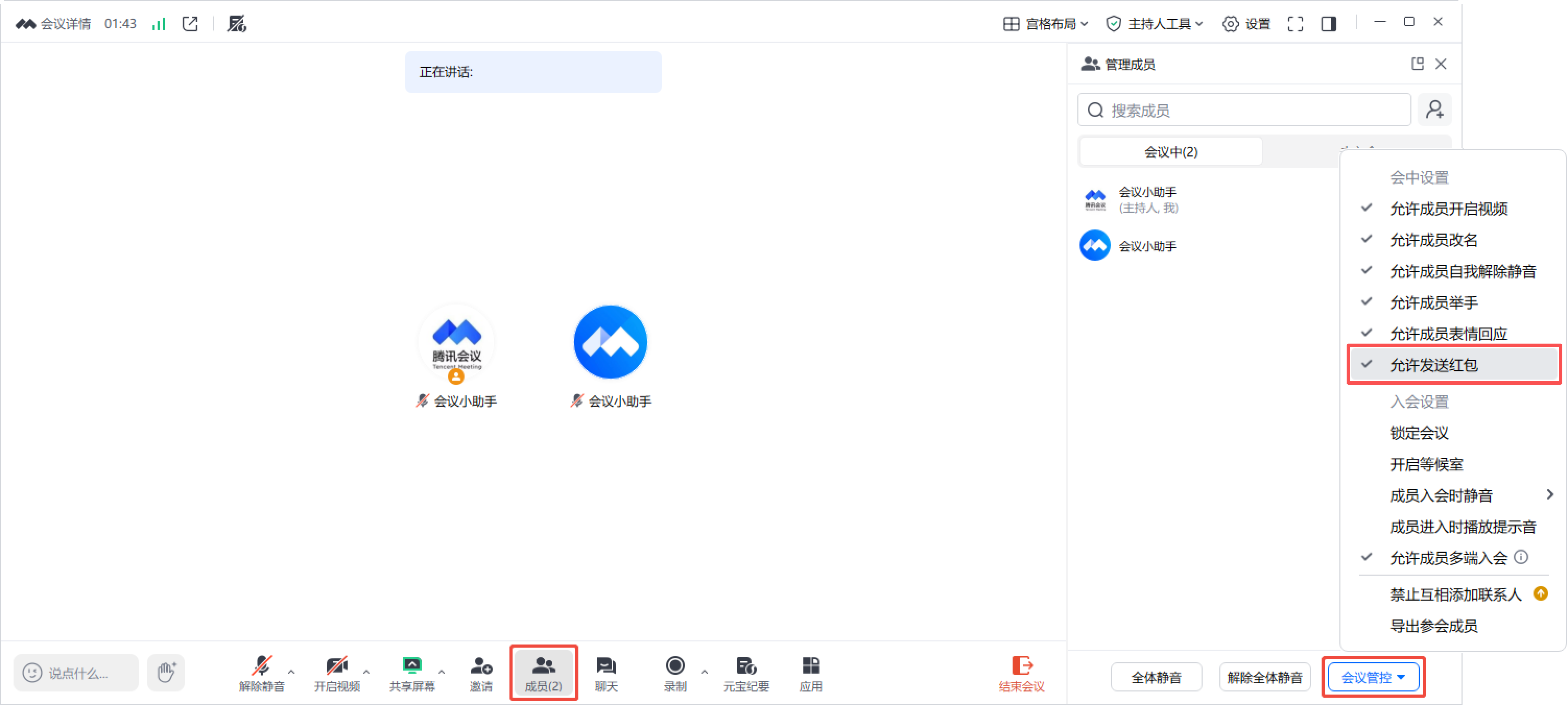 会议中,主持人或联席主持人可单击底部工具栏成员 > 会议管控,通过是否勾选允许发送红包,来管控参会成员的红包功能使用权限。