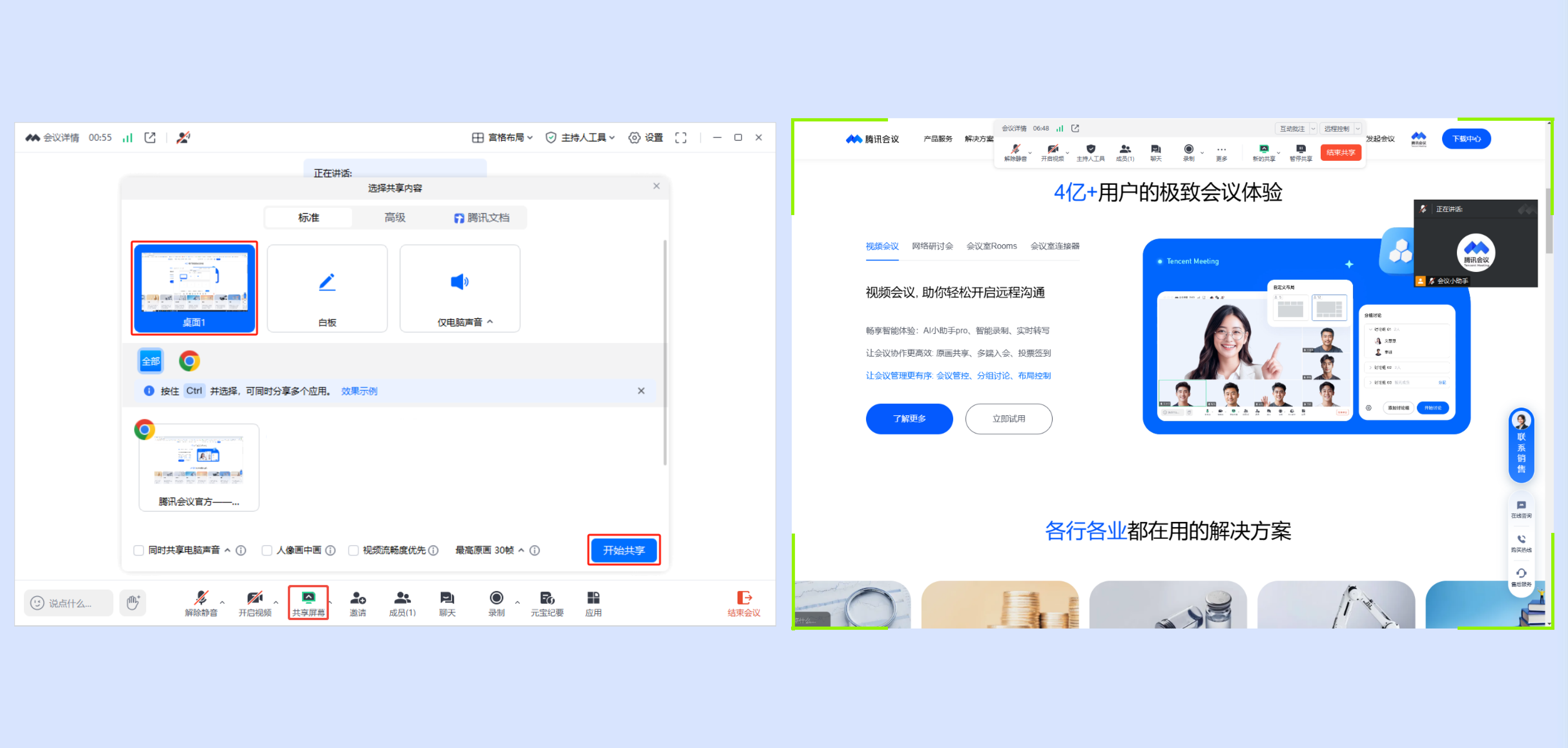 1. 会中单击底部工具栏共享屏幕,选择需要的共享内容,并单击开始共享,即可开启屏幕共享。