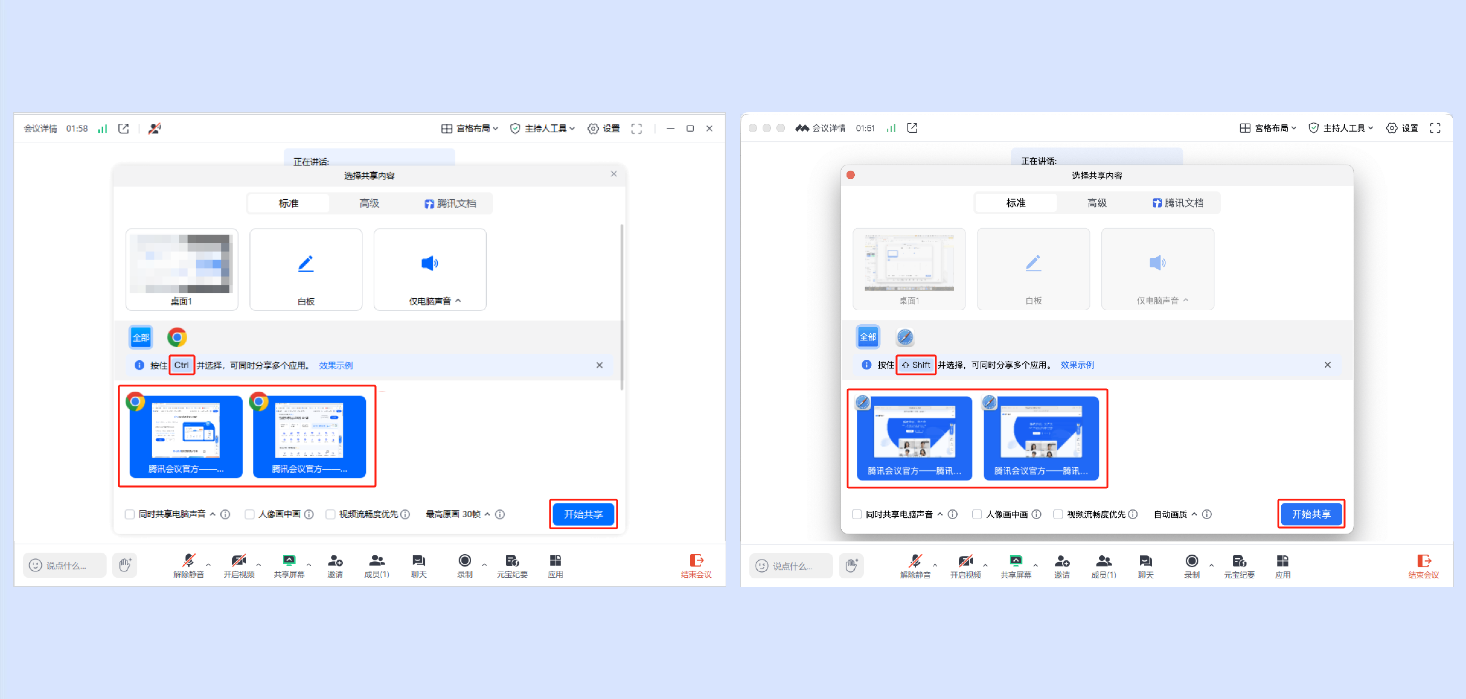 客户端3.30及以上版本支持同时选择多个应用窗口进行共享。