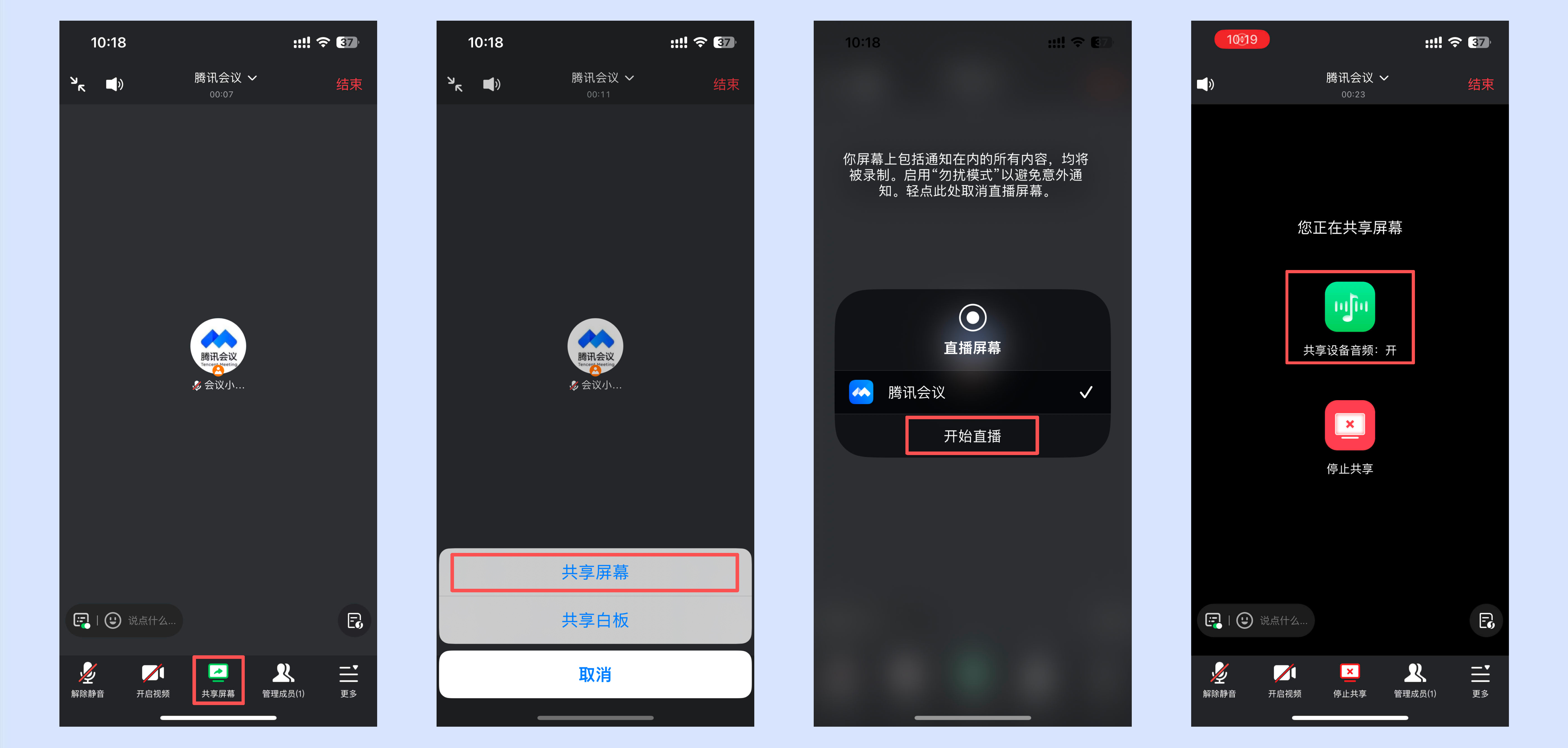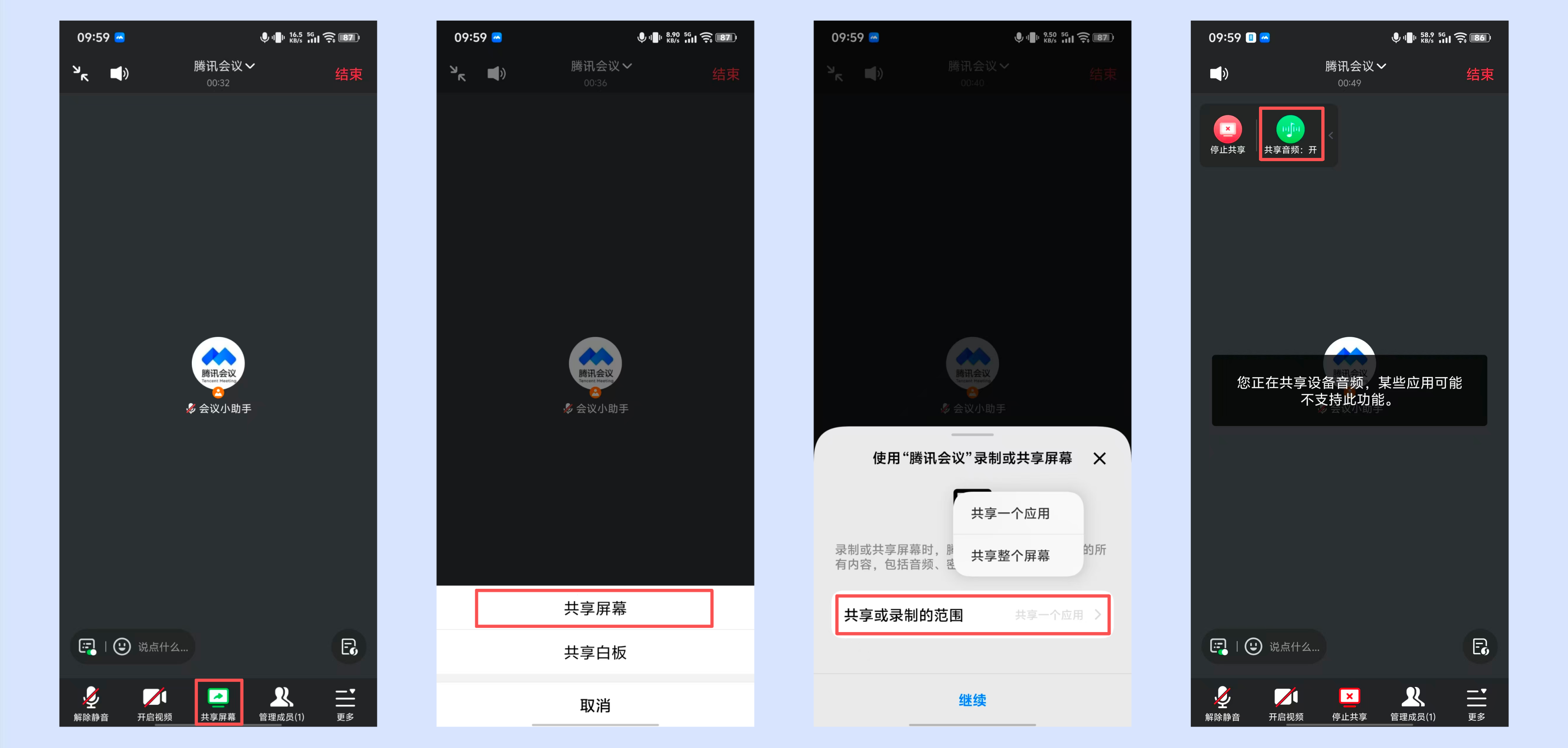 2. 共享时,会将设备音频一并共享给参会者,可根据需要手动开启或关闭共享音频。
