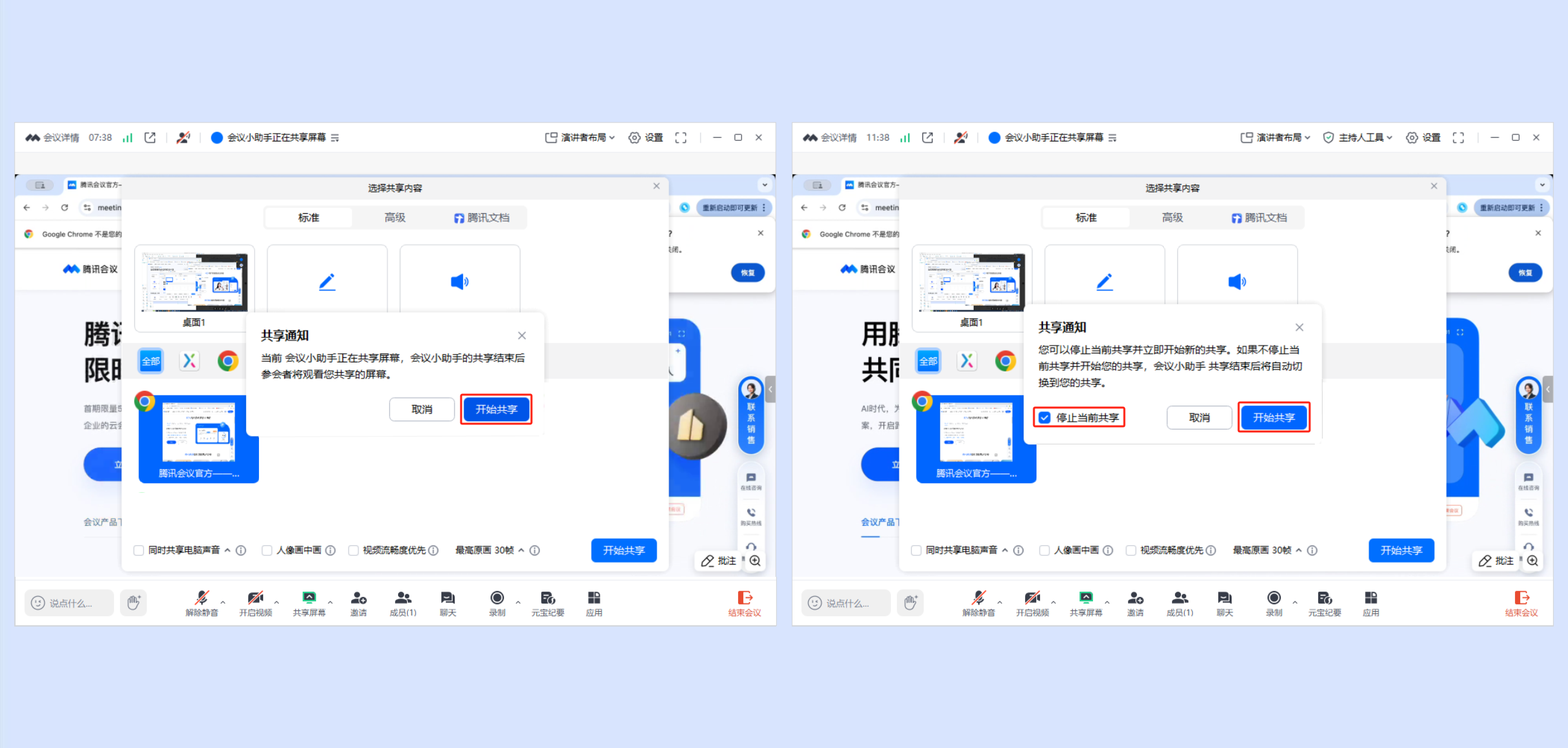 新的共享:可以重新选择共享内容。单击确认共享后,会关闭当前的共享画面,将新的内容进行共享。