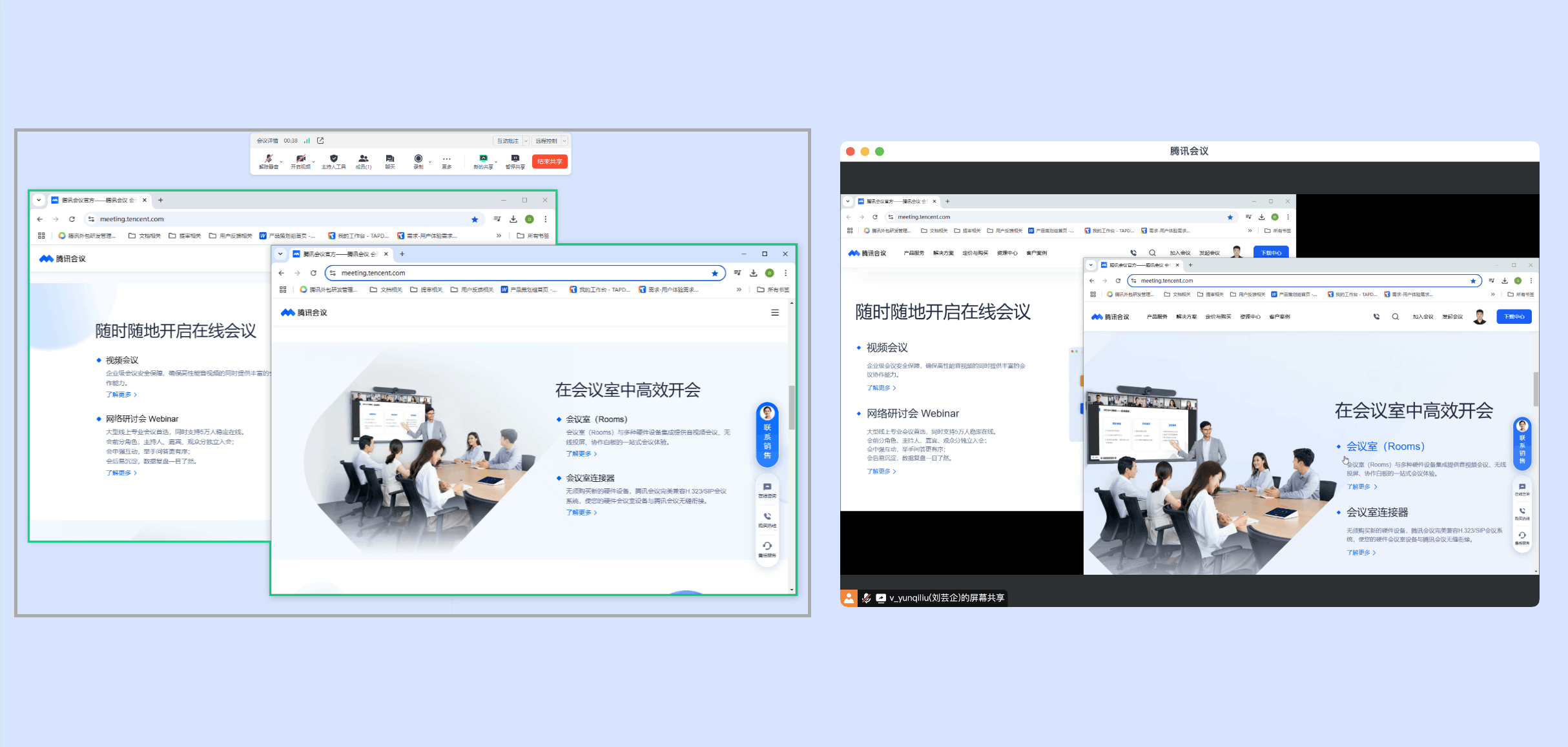 桌面端参会用户可共享和观看同时共享多应用窗口内容;移动端参会的用户仅支持观看。