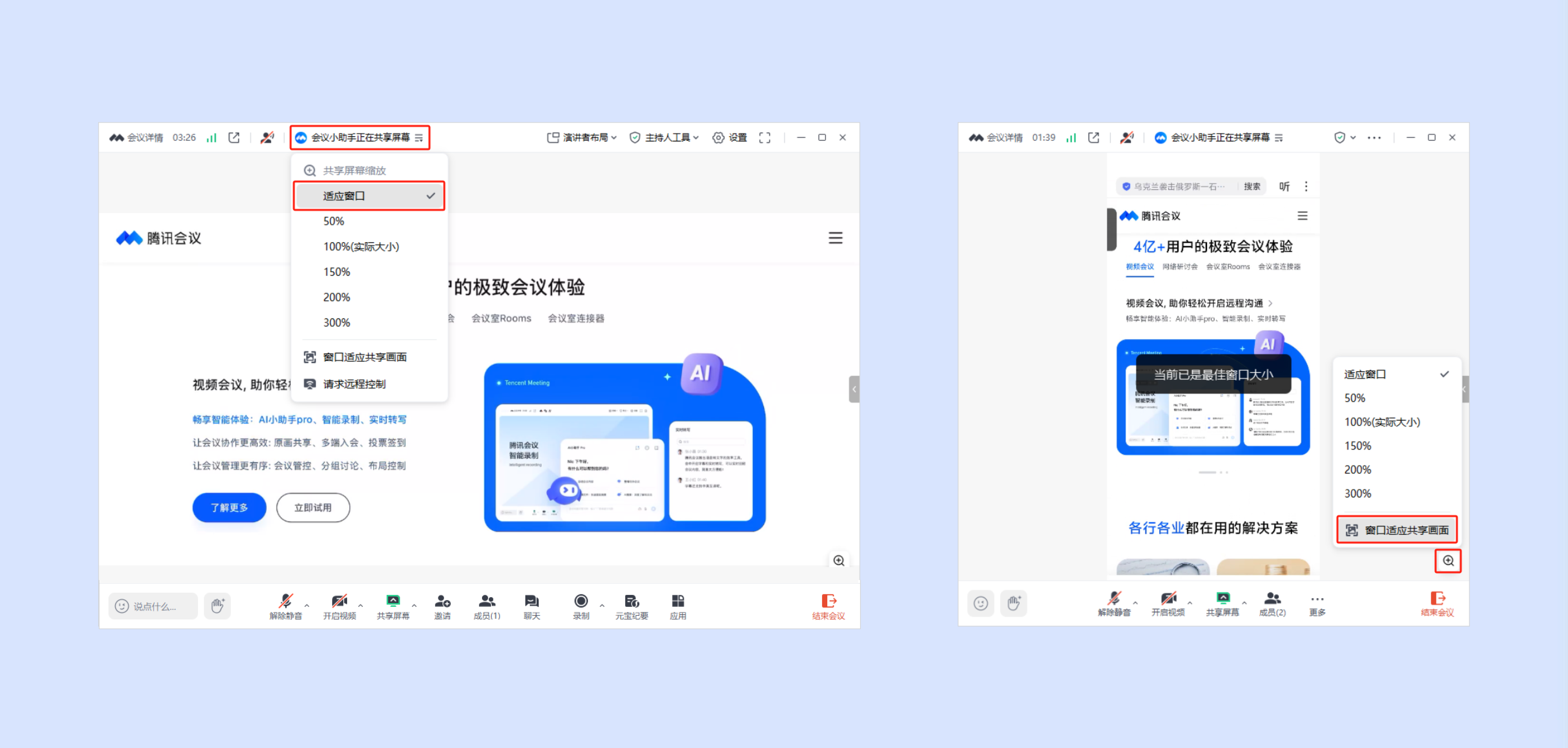 3.31及以上版本支持观看共享屏幕时窗口适应共享画面,设置后窗口将自动适应共享画面的尺寸;可单击画面右下角缩放按钮 > 窗口适应共享画面,设置后窗口将自动适应共享画面的尺寸。