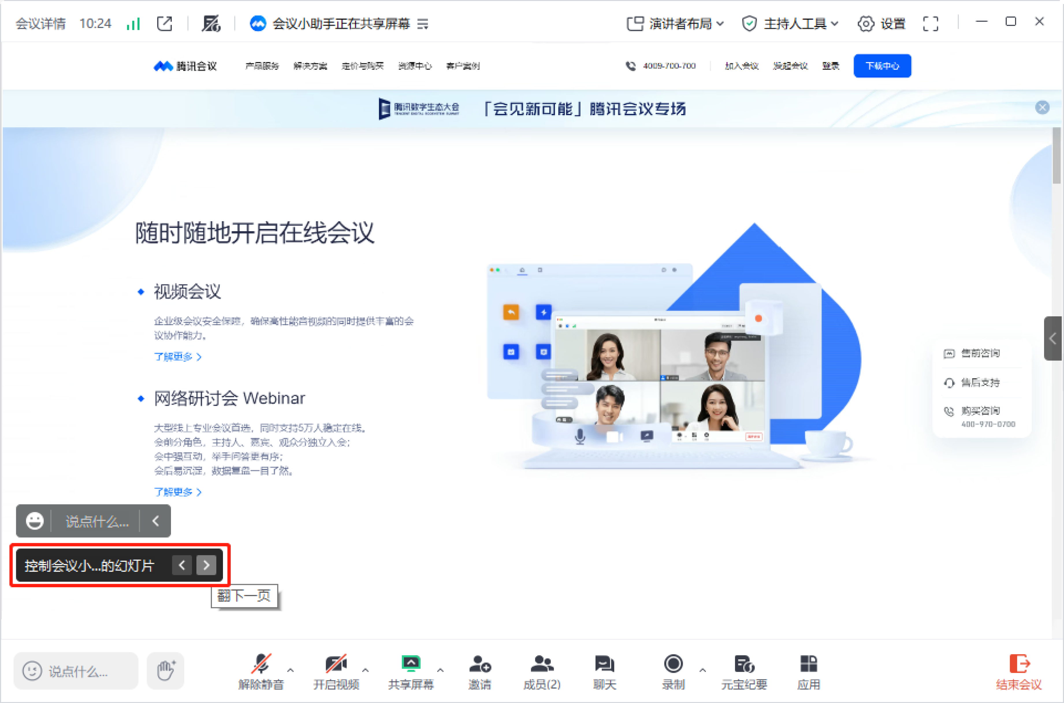 幻灯片控制:当共享 PPT 时,共享者可选择会中成员协助控制幻灯片翻页。