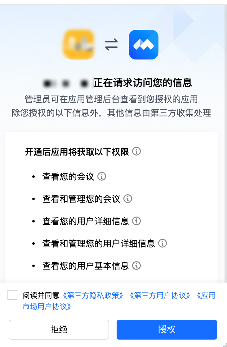 wemeet.permission.requestAuth({corpId: "xxxxxx",sdkId: "xxxxxx",redirectURI: "https://xxxxxx",state: "xxx",});
