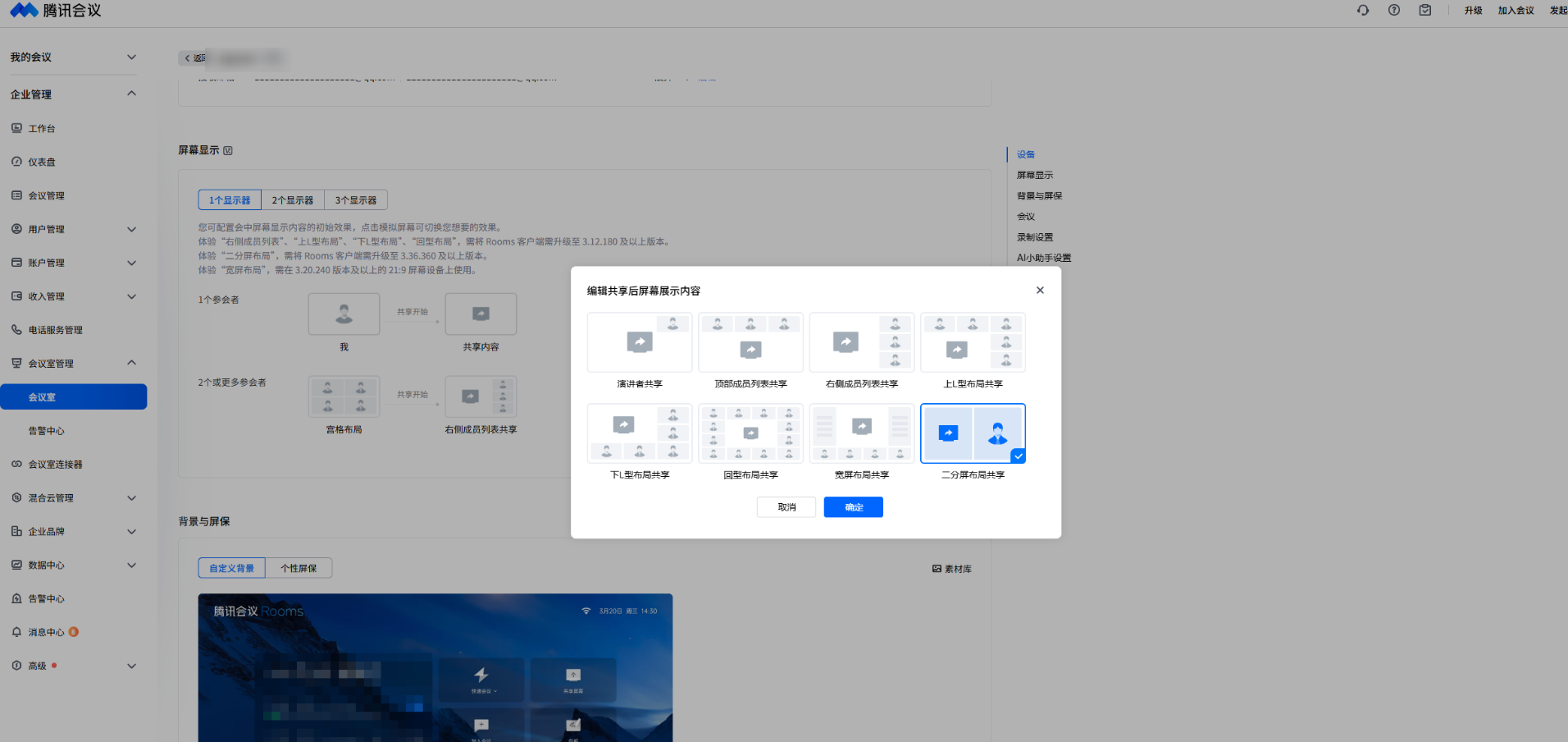 为了满足企业用户在不同场景下对默认显示布局的需求,在 Rooms 设置 > 屏幕设置中,支持企业用户切换显示布局效果。