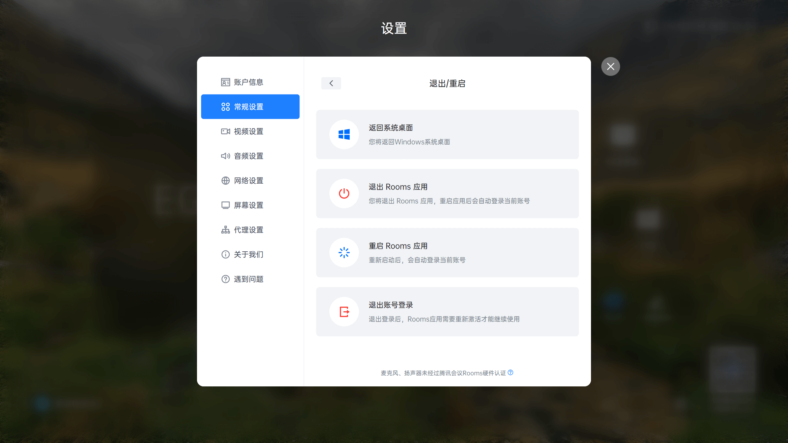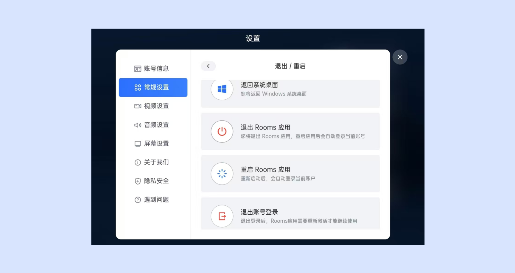 退出/重启应用:您可单击退出/重启 Rooms 应用即可退出或重启 Rooms 应用。