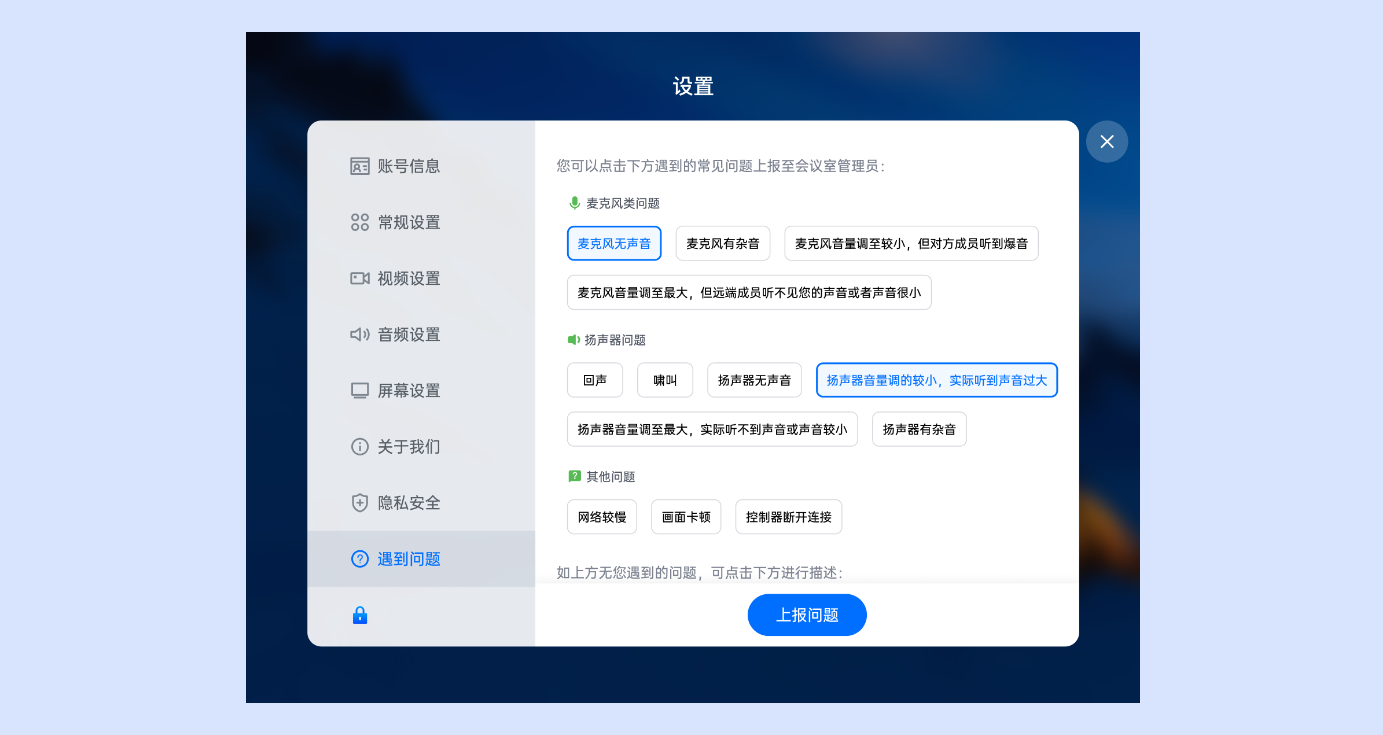 2. 用户可在 Rooms 或控制器的设置 > 遇到问题页面,手动选择常见的问题,或者输入问题,即可上报问题信息至管理员邮箱和告警中心列表。