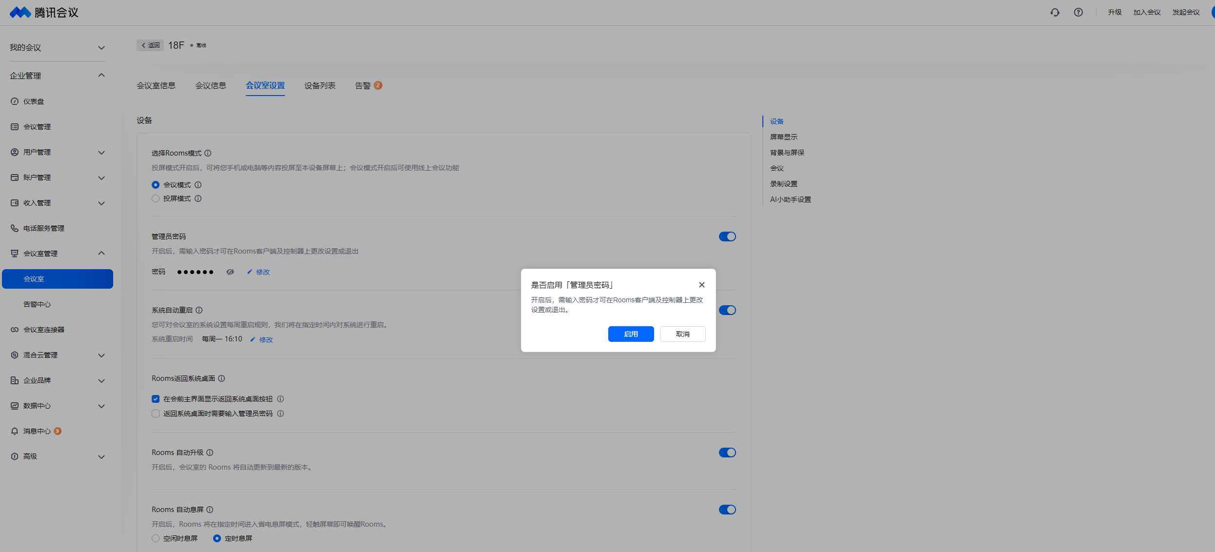 选择任意一个 Rooms 会议室,在会议室设置页中,可开启/关闭管理员密码,打开后需要输入管理员密码。