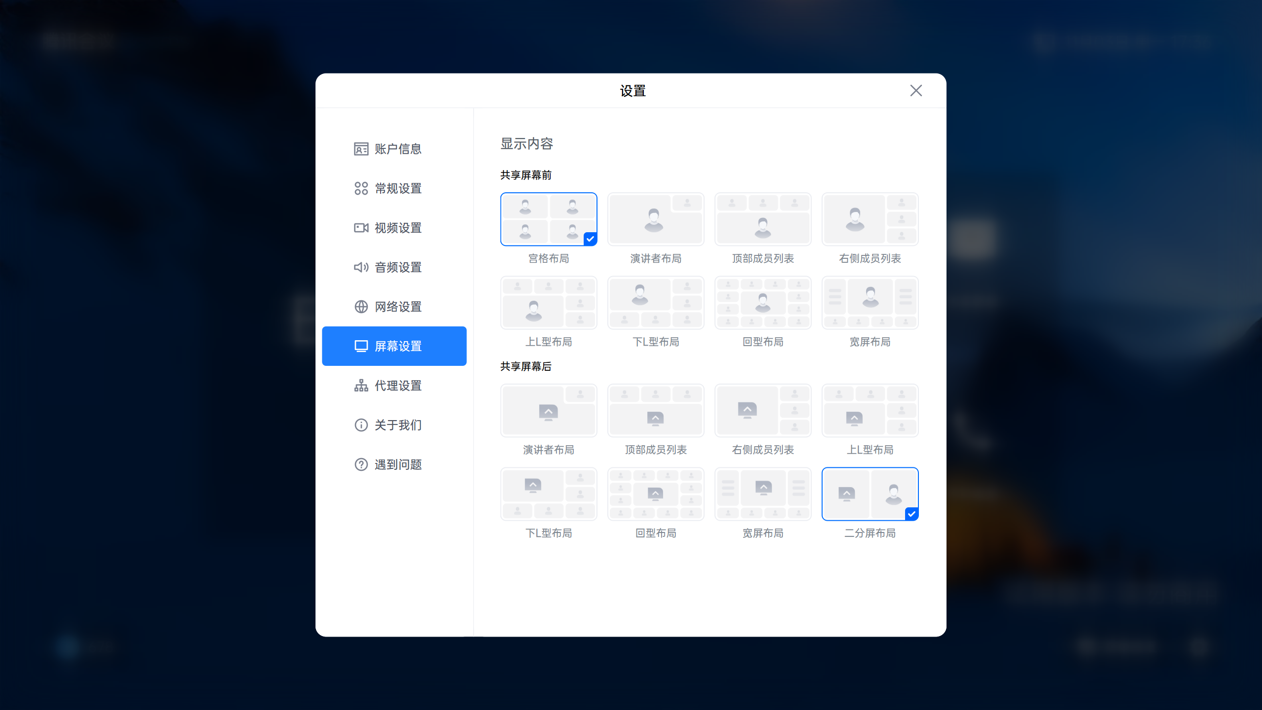共享内容:默认顶部成员列表共享,可切换为演讲者、顶部成员列表、右侧成员列表、L 型布局、回型布局和二分屏布局共享等。