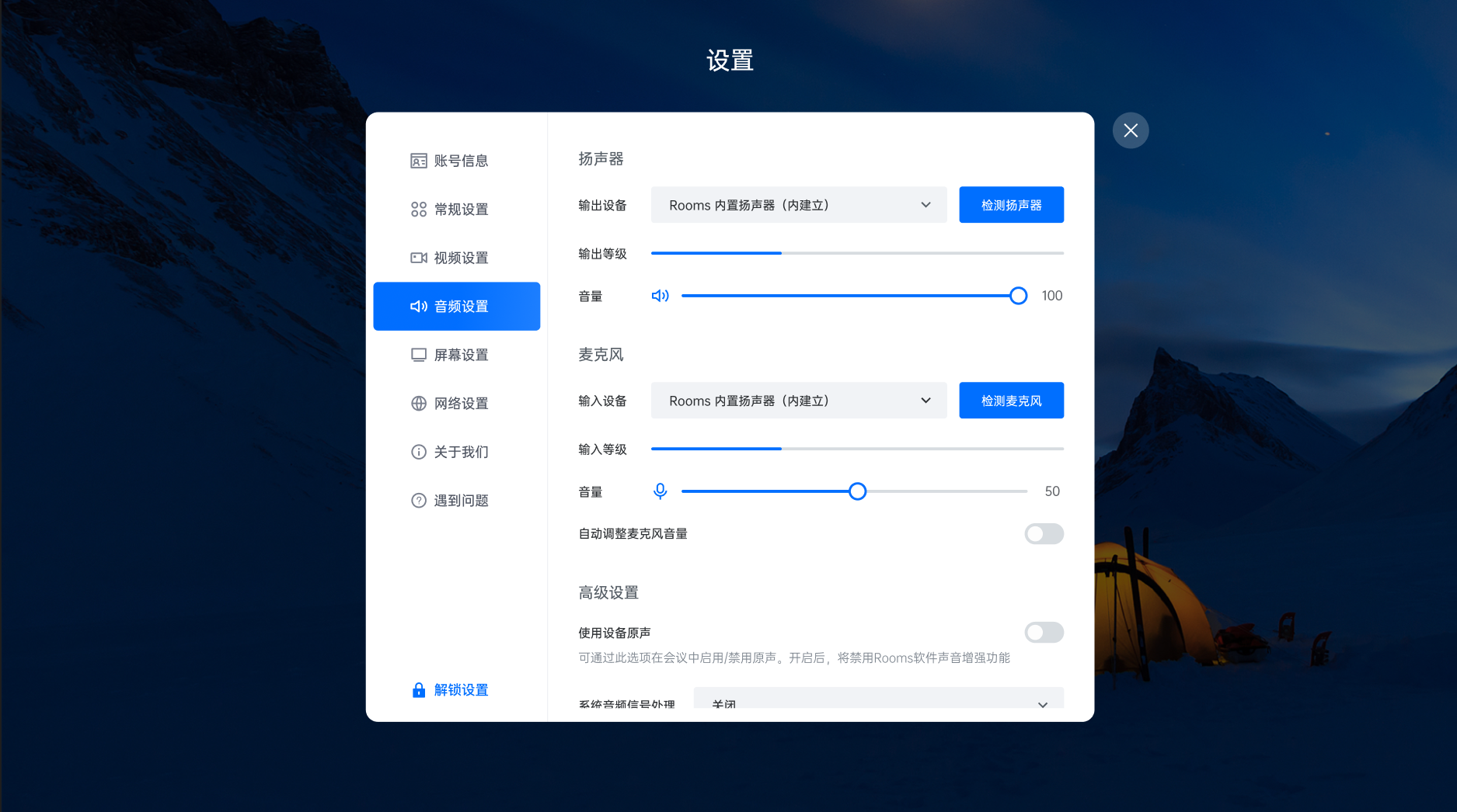 自动调整麦克风音量:开启后,可自动调整 Rooms 麦克风音量。